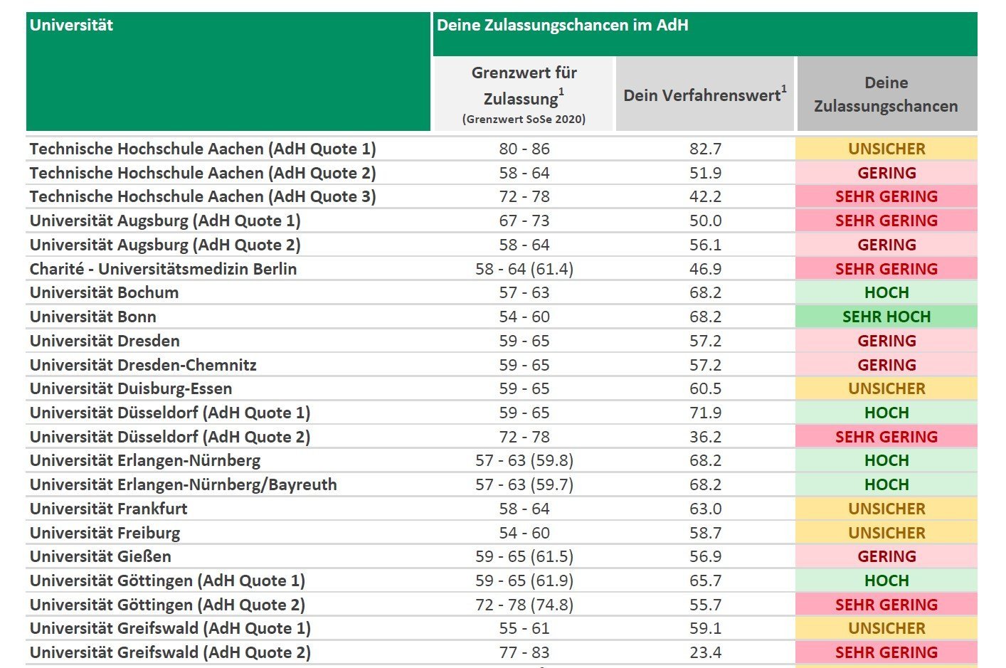 Има сайтове, в които може да изпратиш резултата от изпита ТМС и дипломата. Срещу определено заплащане изчисляват какви са шансовете в различните университети. Не знаех с колко точки ще оценят дипломата, т.е. провинция, лотария и още фактори, които не са ми много ясни. Тази година вече като наближи времето се сетих за този сайт и реших да рискувам. Платих и получих техния анализ. Предварително им писах да ги питам колко точки да нанеса в графата с дипломата. Впечатлена съм от това, което даде анализа и от къде получи оферта кандидат - докторката. Анализа е само за квотата AdH. В писмото ме предупредиха, че все пак е минал само 1 семестър с новите условия.