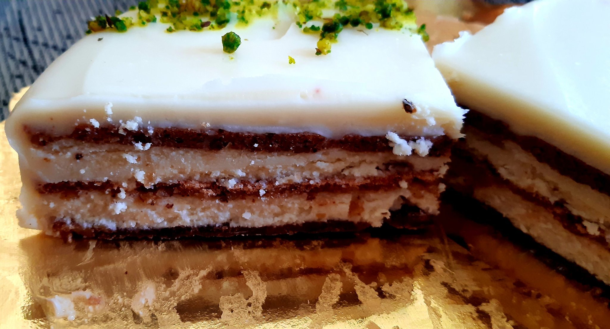 Авторът разкрива, че десертът е импровизация без конкретна рецепта. Основата е бутер тесто, изпечено до златисто между две тави за равномерна и плоска текстура. Кремът се състои от мляко, нишесте и захар, наподобяващ домашен крем от яйца, брашно и мляко. Включени са малини и черен шоколад. Авторът предлага да сподели връзка към рецепта, която е подобна на тяхното творчество.