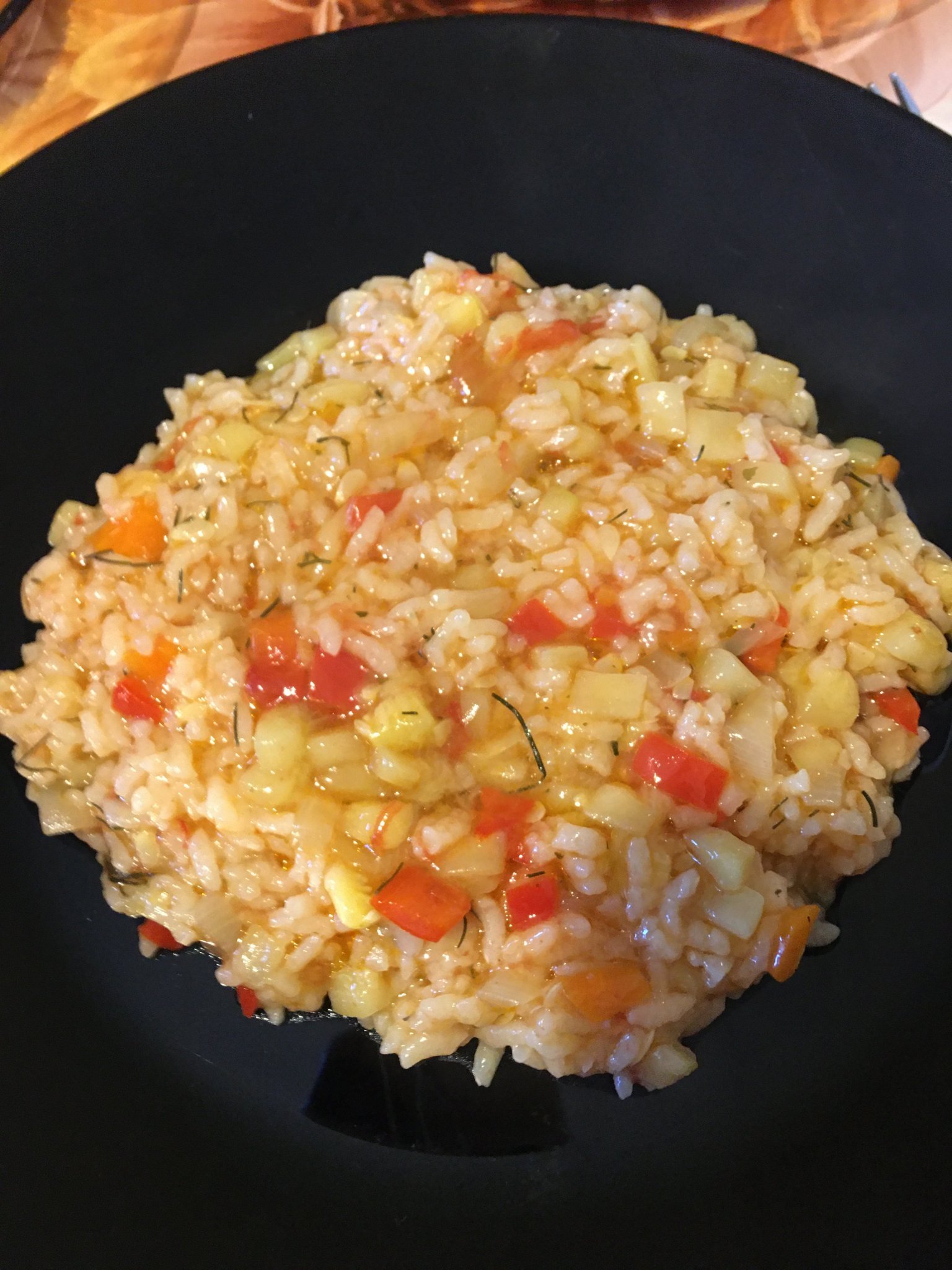 И един ориз с тиквички, моркови, лук, чушка, копър и домати.