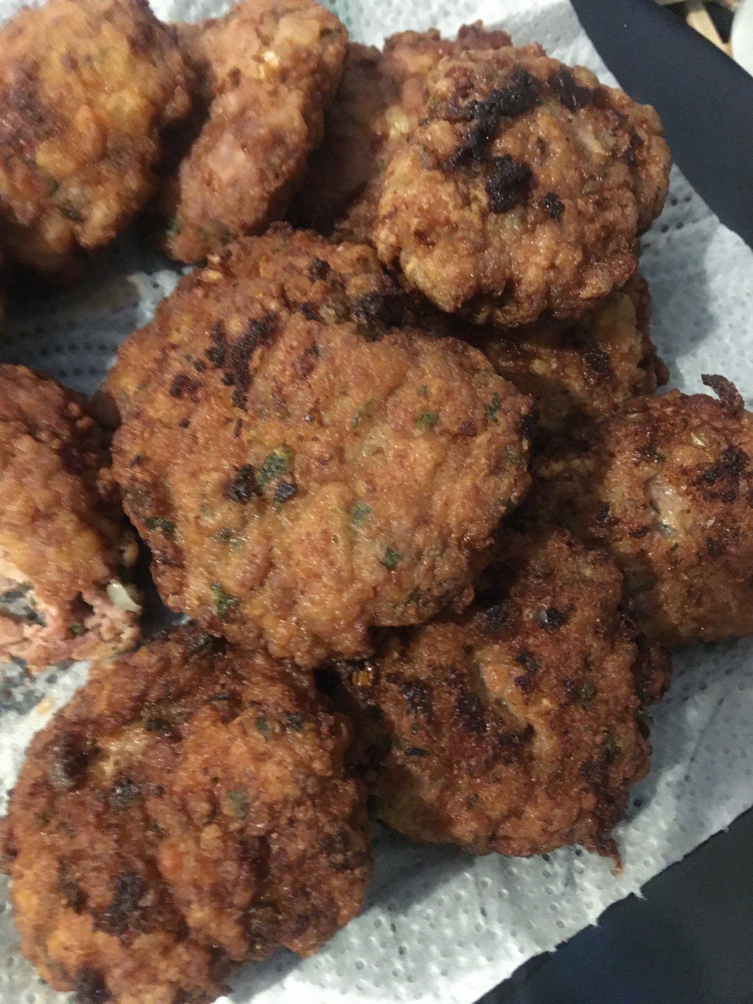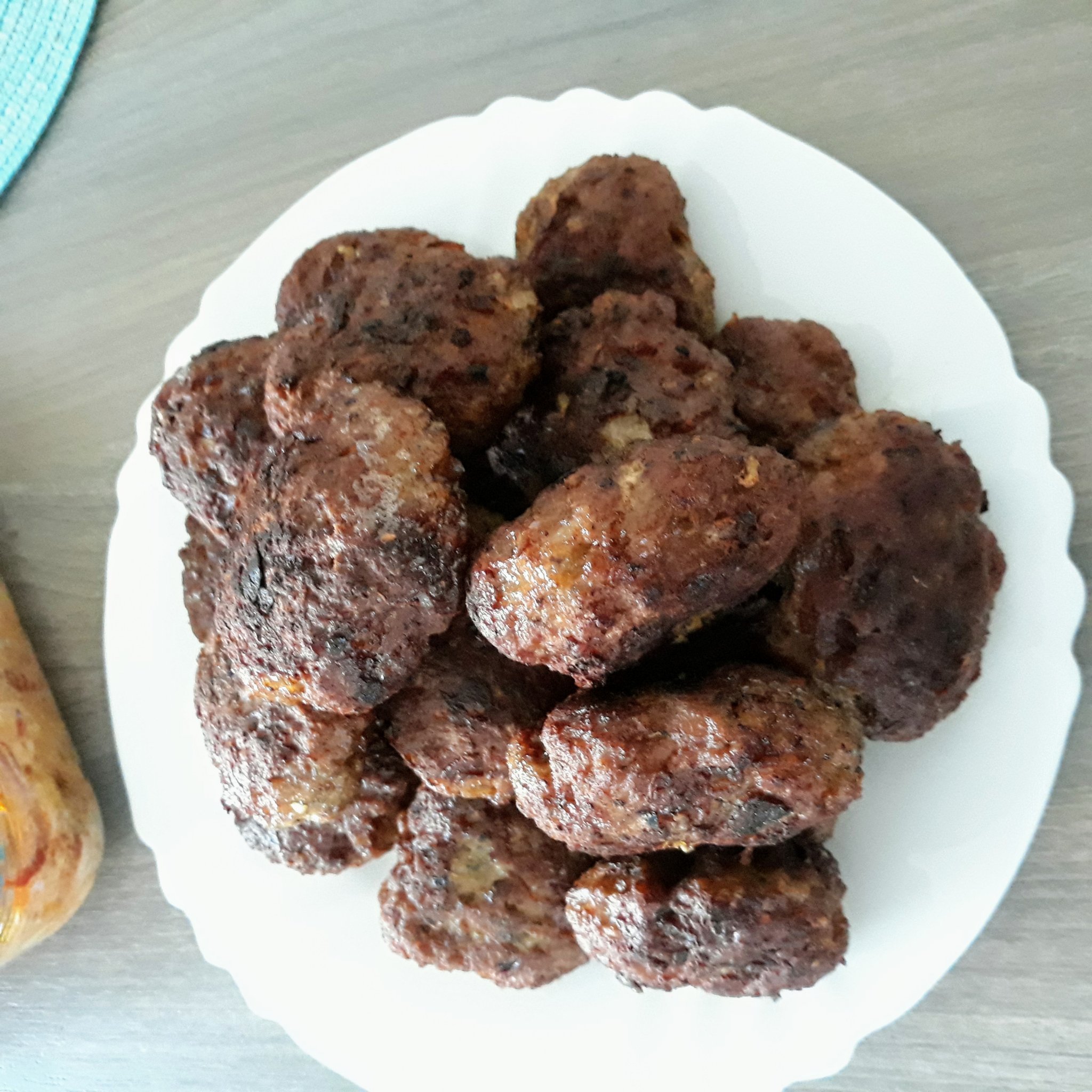 500 гр кайма, две филийки хляб потопени във вода, 1 яйце, магданоз, глава лук, чубрица, сол и пипер. След което ги овалях в брашно и така пържих. Станаха адски сочни и меки отвътре и хрупкави отвън 😋