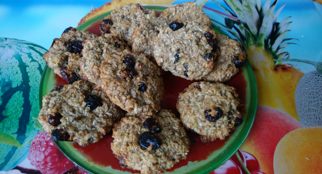 Овесени бисквити с банани, кокосови стърготини и сушени червени боровинки