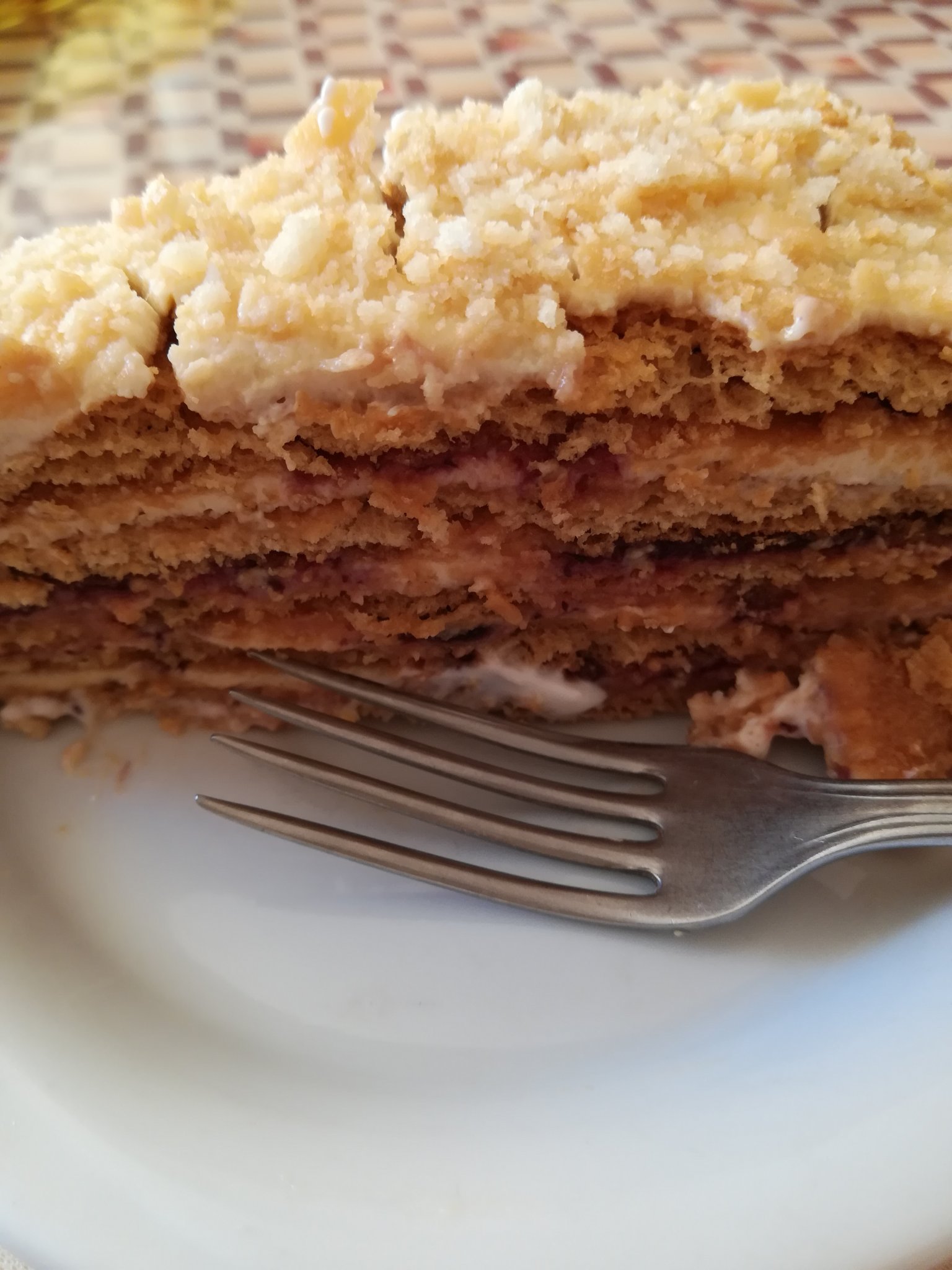 Авторът разкрива, че десертът е импровизация без конкретна рецепта. Основата е бутер тесто, изпечено до златисто между две тави за равномерна и плоска текстура. Кремът се състои от мляко, нишесте и захар, наподобяващ домашен крем от яйца, брашно и мляко. Включени са малини и черен шоколад. Авторът предлага да сподели връзка към рецепта, която е подобна на тяхното творчество.