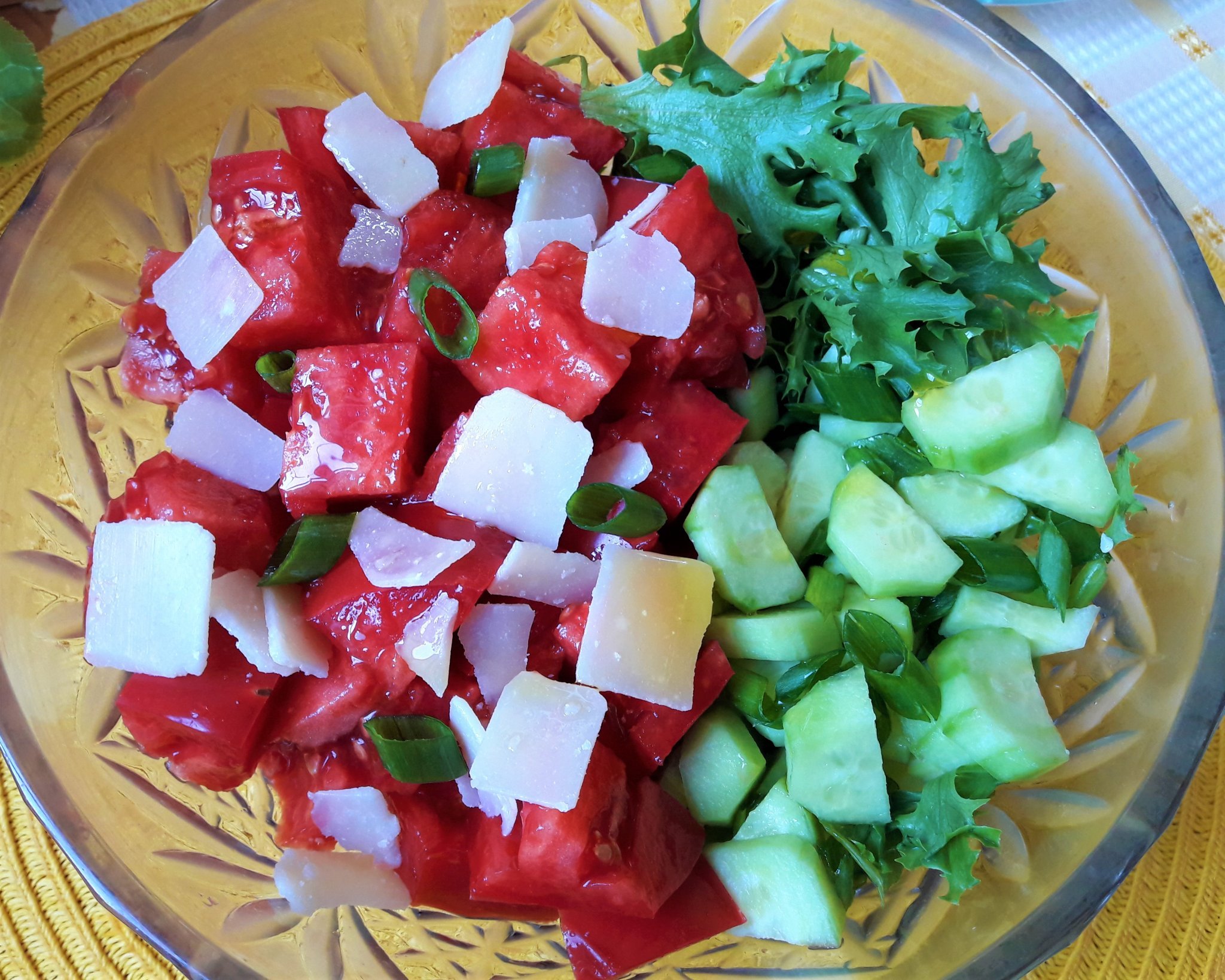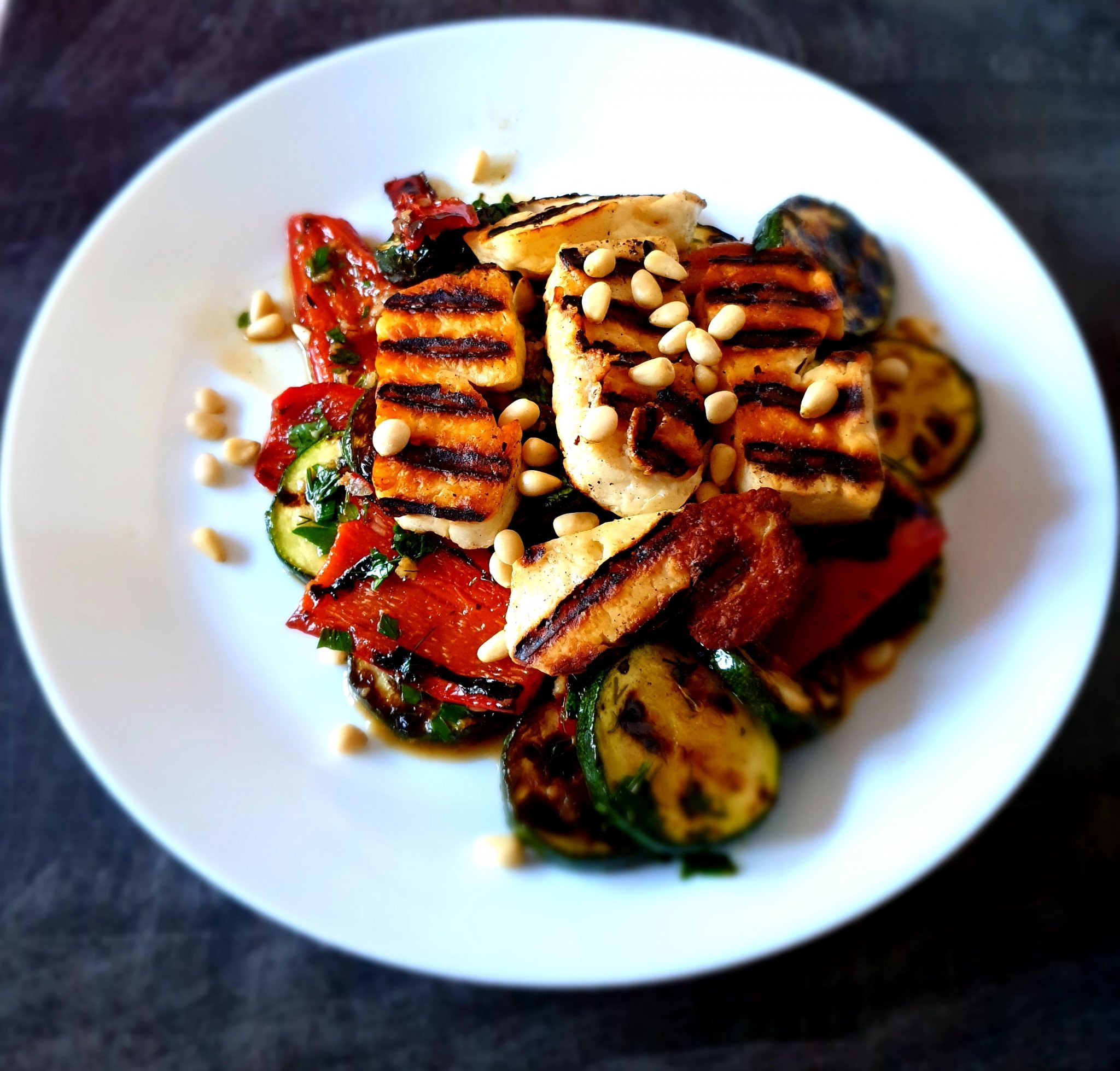 Днес обядвахме гриловани зеленчуци със сирене халуми и кедрови ядки. Дресингът е от зехтин, лимон, чесън, копър, магданоз и пресен джоджен.