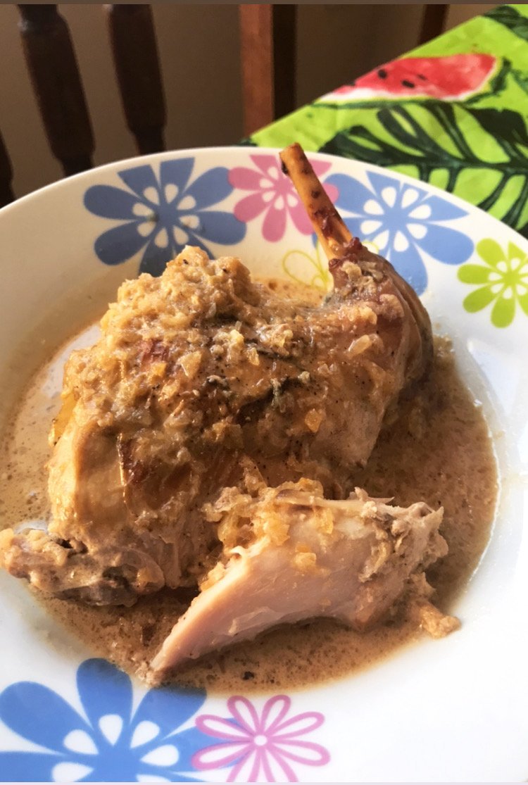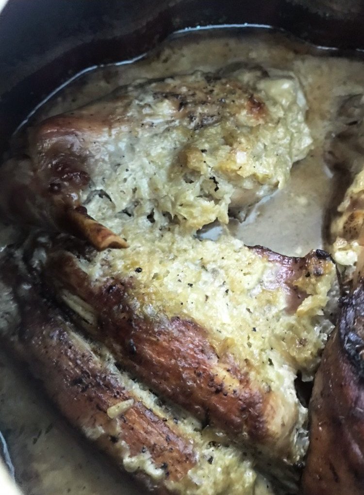 Заешко със сметана и чесън в гювеч, по рецепта от форума