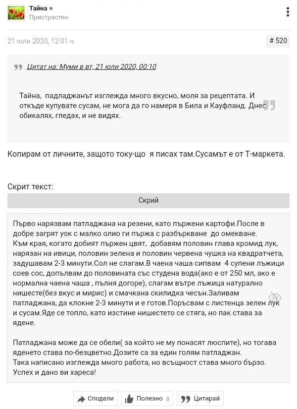 Къде мога да видя и аз рецептата за патладжана на Тайна?