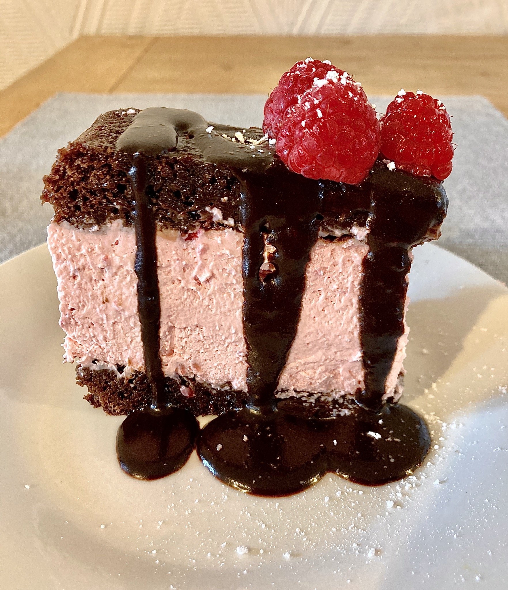 10. Пригответе малиновото кули, като пюрирате малините, пудрата захар, лимоновият сок и 4 листа от босилек. Малиновото пюре минете през фина  цедка, за да се получи хомогенна смес без твърди частици.  Полейте тортата с малиновото кули и се насладете.