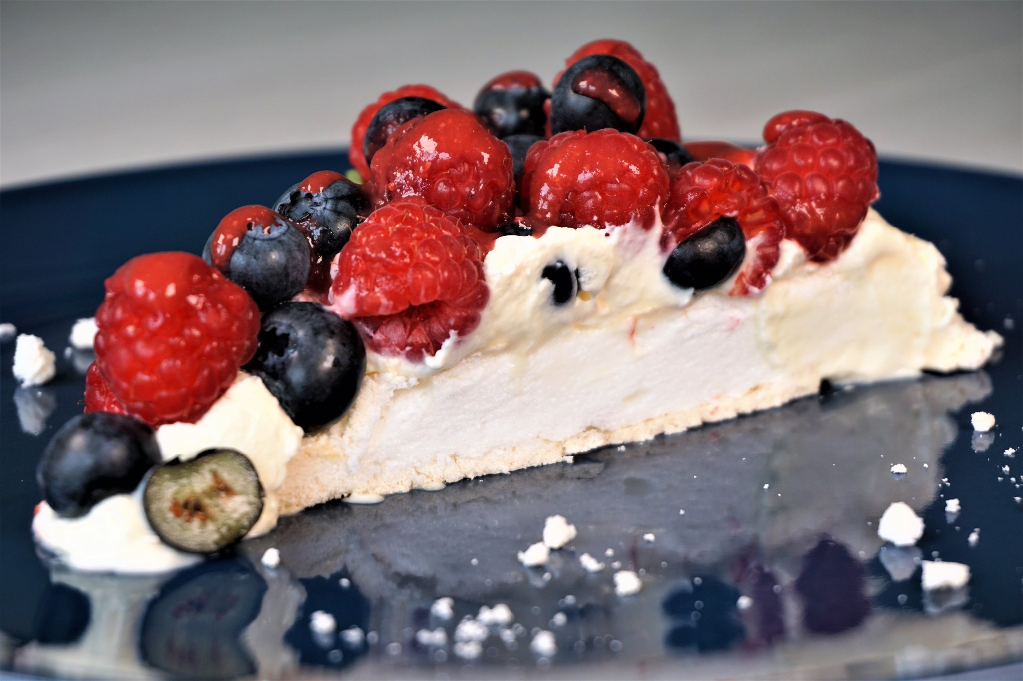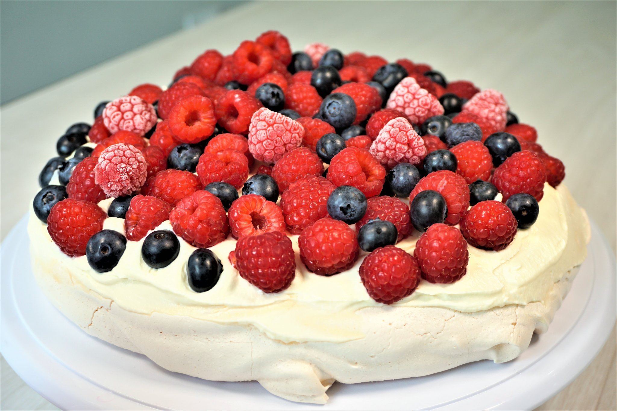 Здравейте, днес предлагам едно сладко изкушение, което провокира сетивата– торта Павлова с малини и боровинки.