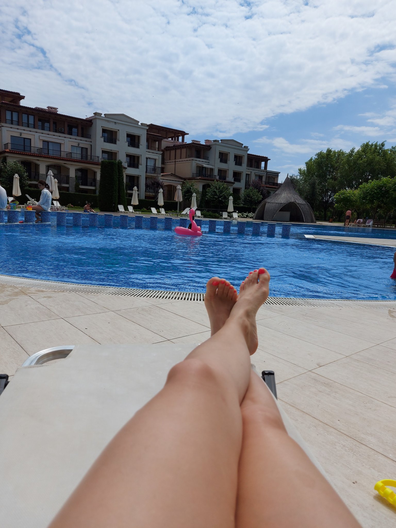 На фона на снимката,  дъщеря ми се бори с едно розово фламинго. Солени целувки от нас.