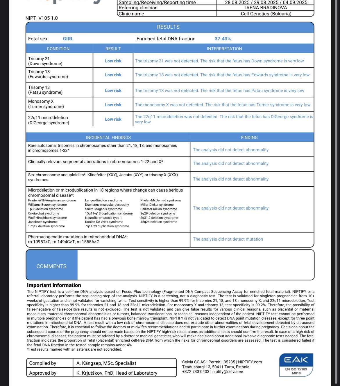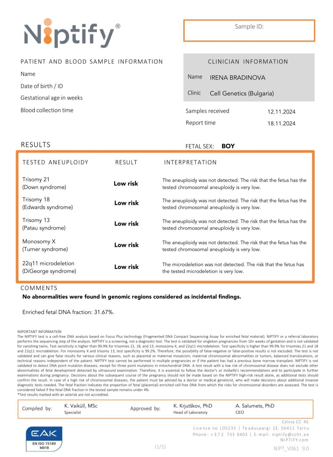 Аз правих Niptify в 10г.с+0 дни, резултатите излезнаха за седмица (вчера). От отношението също съм много доволна. Реално малко след 14ч ги качиха в сайта и по-късно ми се обадиха от Cell Genetics, за да кажат, че всичко е наред и дали имам нужда от разясняване на нещо. Ето така изглеждат, като имат и превод на Български: