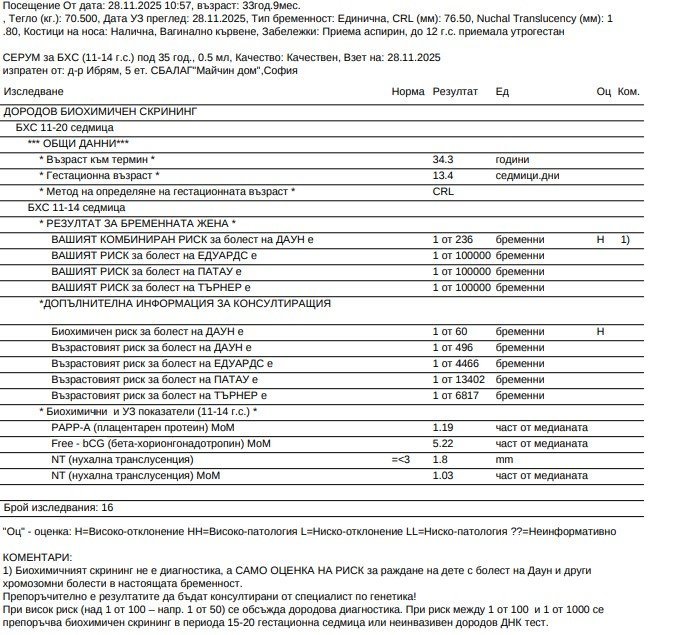 Е пуснах си резултатите и освен, че не виждам резултат за риск от прееклампсия, стойностите за синдром на Даун направо ме втрещиха, както и резултата на bCG.