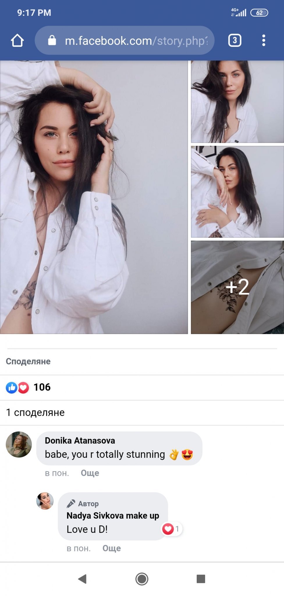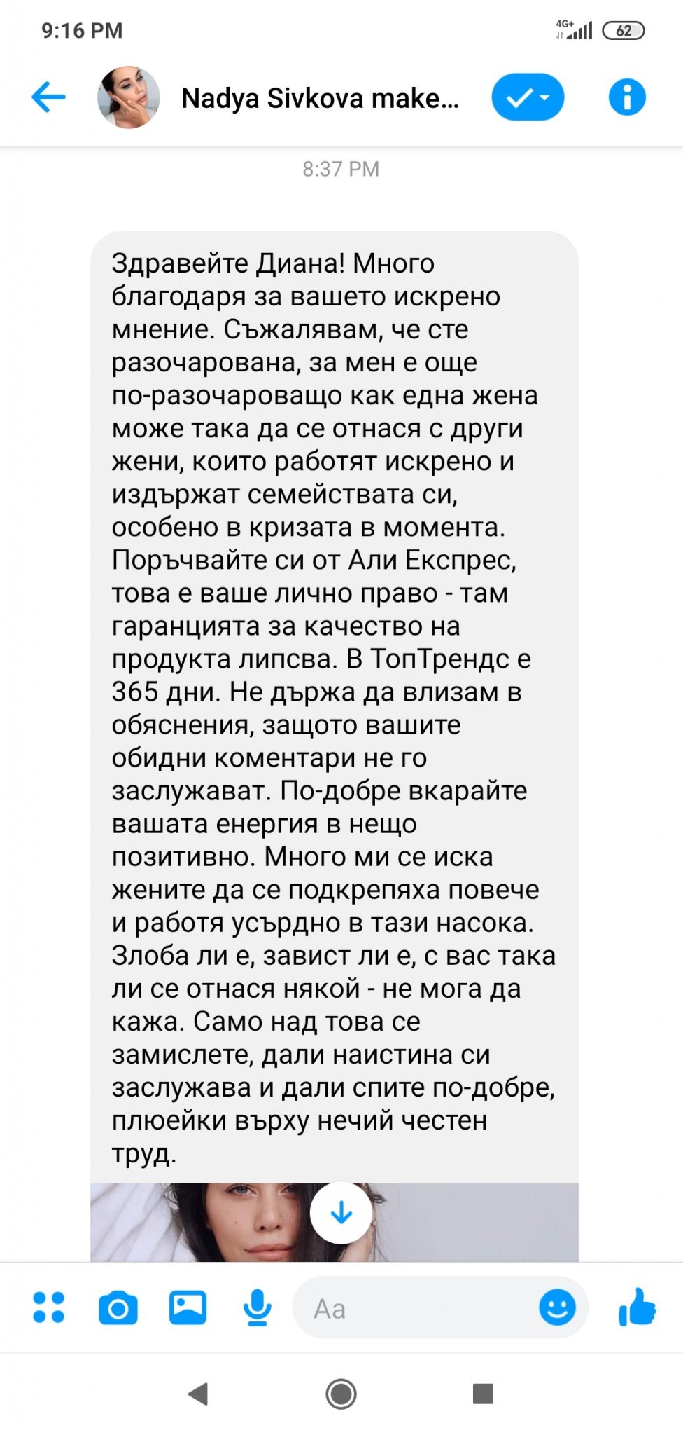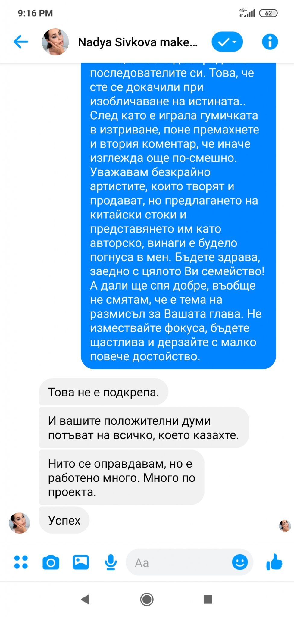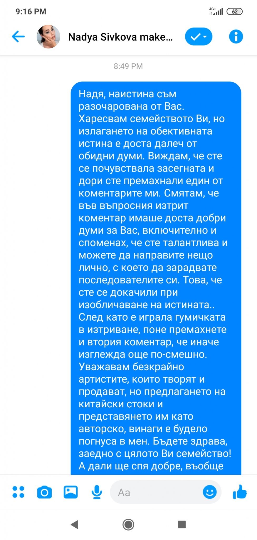 Днес, под публикацията ѝ за татуировки във Фейсбук, написах два коментара. Първият гласеше, че съм изумена от авторската им работа, тъй като всеки технически грамотен човек може да провери татуировките им и да открие, че се продават в Алиекспрес за долар. Написах на Надя, че я харесвам и смятам, че е некоректно. Вторият ми коментар бе с въпрос колко труд са вложили, докато изработят колекцията. Минаха се часове и получих лично съобщение, което ме изненада. Някоя от вас може би бе прочела коментарите ми, понеже имах получени харесвания. Е, ако някоя ги е видяла, нека сподели дали имаше нещо обидно към Сивкова.