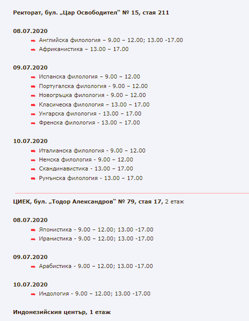 Поредната новост от страна на СУ : Записването на приетите на първо класиране кандидат-студенти в съответната специалност ще бъде в точно определен от университета ден, като вече има изнесен график за Факултета по класически и нови филологии и източните филологии. Примерно - Немска филология и Италианска филология - на 09.07, в точно уречени часове. Тоест няма да може самите кандидати да избират в кой ден да отидат и да се запишат, а трябва всичките от една и съща специалност да го направят в един и същи ден, определен от съответния факултет.