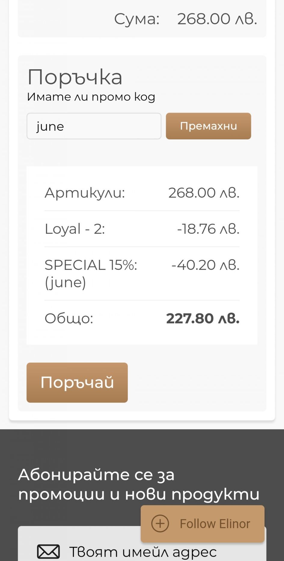 Обединени текстове: Някои популярни онлайн магазини за парфюми в България включват Notino.bg, Elfragranse.bg, Parfiom.bg, Makeup.bg, Parfumitе.eu, Dolce.bg, Douglas.bg, Brasty.bg и Get. bg с различни опции за доставка на цени в зависимост от избраната фирма и условията за безплатна доставка . Например Notino предлага доставка чрез различни куриерски фирми като Speedy, Econt и APs на Speedy с цени от 2 до 5,95лв. в зависимост от избраната опция. Elfragranse предлага нормална доставка за 4,99лв., експресна за 6,99лв. и ултра експрес за 9,99лв. Parfiom използва Speedy за доставка с цена от 4,90лв., безплатна при поръчки над 200лв. Makeup предлага безплатна доставка при поръчки над 39,00лв. и такса за доставка от 2,90лв. при поръчки под 39,00лв. Някои от най-популярните парфюми, които хората поръчват онлайн в България включват Chloé Nomade EDТ, Gucci Guilty Absolute Pour Femme , Jean Paul Gaultier La Folie , Boss Bottled Night Eau de Toilette за мъже и жени, The Only One Intense и The Only One за жени. Други популярни избори са Mr. Burberry, Eau de Rhuba rbé Écarlate, Eau de Citron Noir, Girl in Capri, Coquette de Cha nel и много други. Тези парфюми често се избират от онлайн купувачи в България.