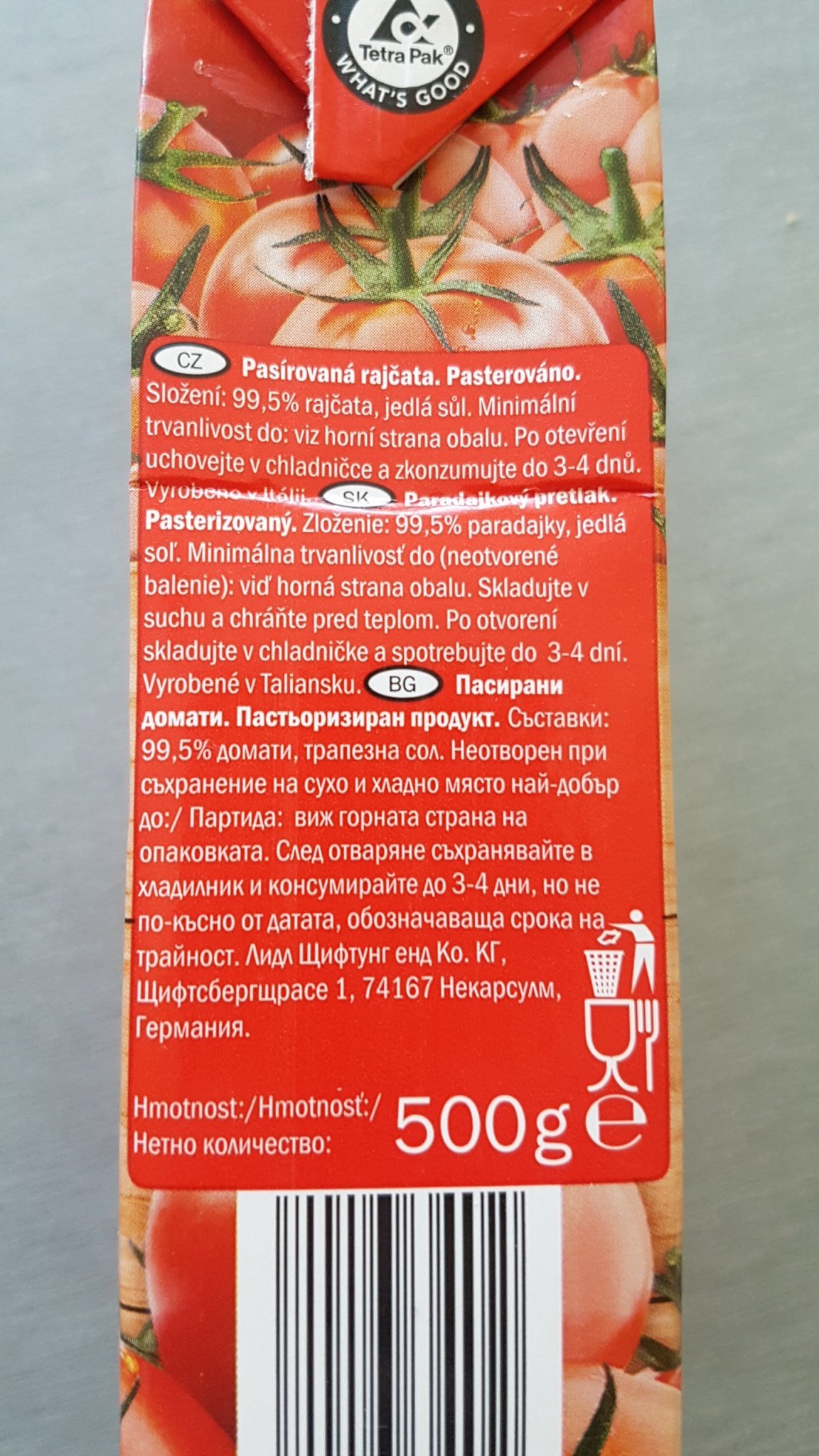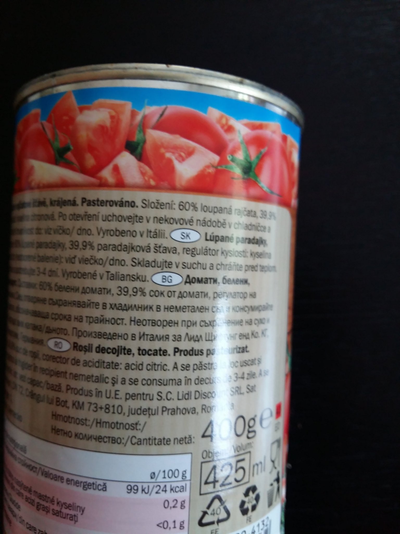 Лимонена киселина, регулатор на киселинността, белени домати и сок от домати.