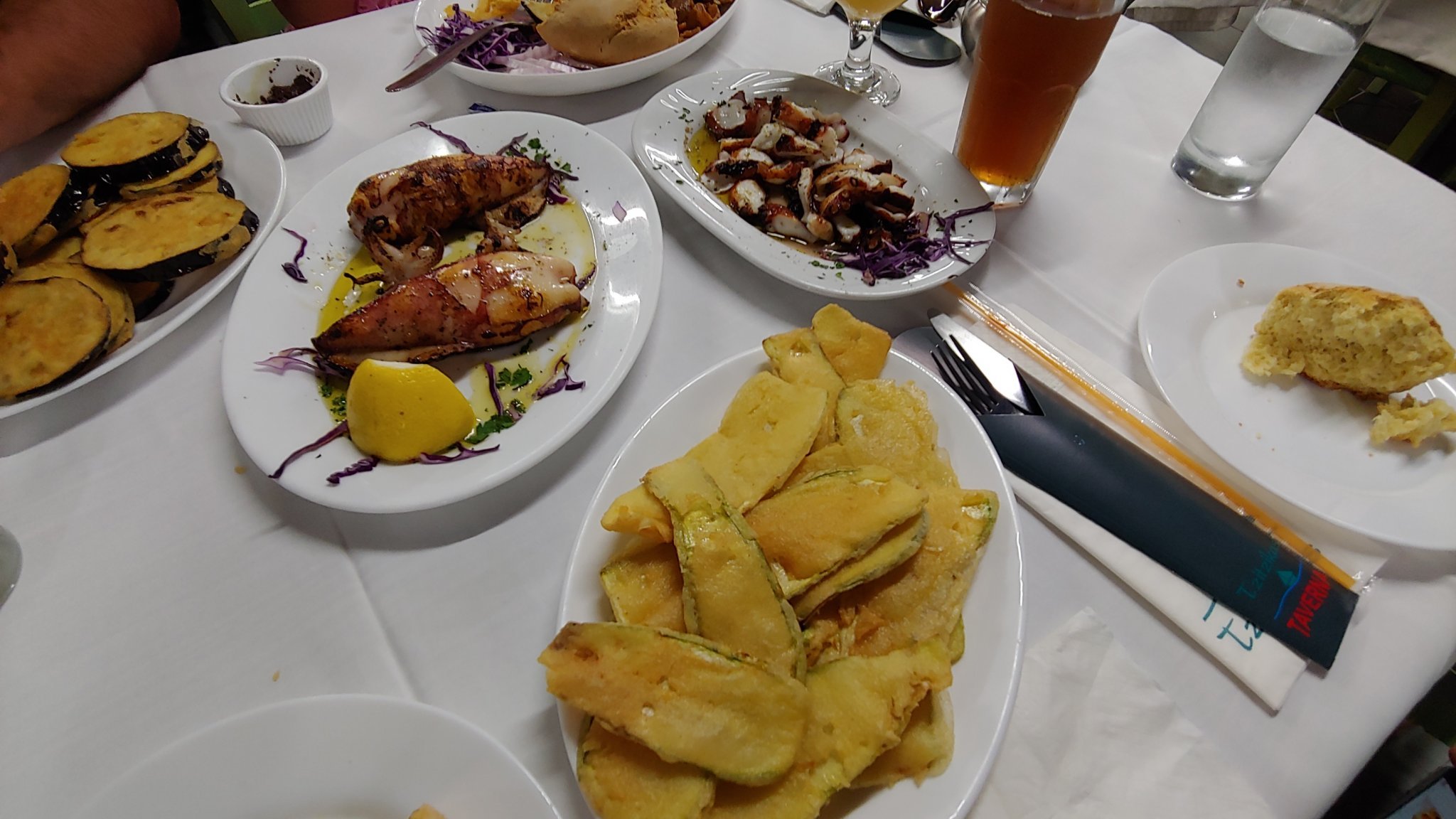 В Tzitzikas препоръчвам пържените тиквички и пълнения калмар с фета. Там накрая ни поднесоха и комплект с десерти, както в Порто Марина, имаше и много интересни бели хавлиени, горещи кърпи, ароматизирани. Донесоха ги увити в найлон като варена царевица Joy та си рекох, вместо пасти - царевица Joy а то горещи кърпи.
