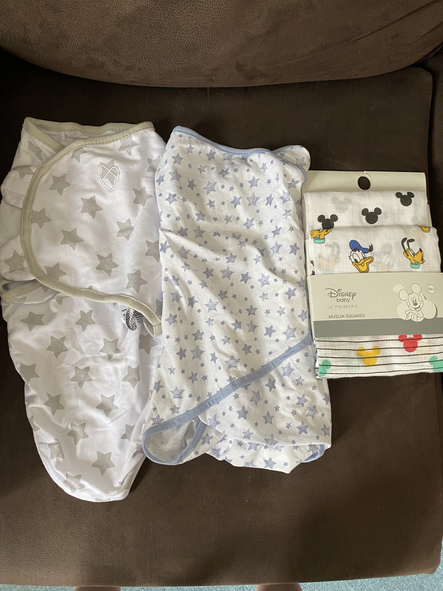 4 муселинови пелени, 1 за кошарката в родилното, 1 да я подложа като я сгъна на две под главичката, 1 за завиване ако е много топло и не става с одеалце, и 1 за резерва.