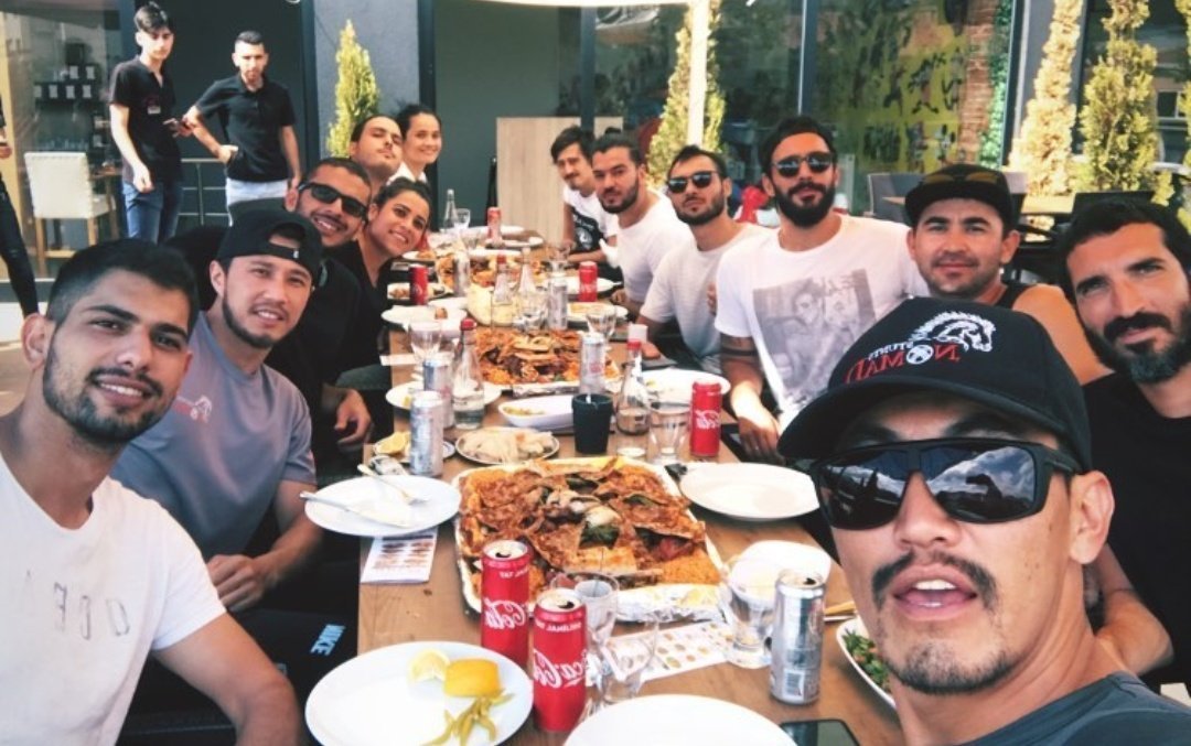 Обядвал е с каскадъорите-това са май  тия дето го учиха на езда ..