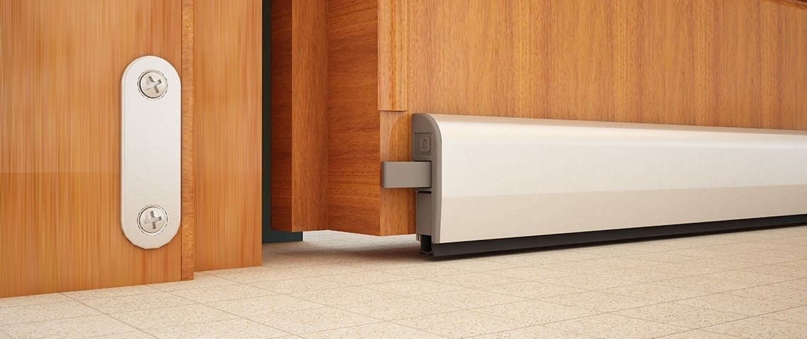 За по-голяма яснота давам пример с падащ праг за външен монтаж. Има и такива, които се монтират не отвън, а вътре във вратата и не се виждат. За металните врати е съвсем удобно да има вътрешен праг, защото там няма нужда от вкопаване. Най-общо идеята е, че когато вратата се затвори това нещо пада на пода и уплътнява процепа под вратата, а когато натиснеш бравата за да отвориш,  вътрешен механизъм го повдига и вратата си се отваря без онова нещо да стърже по пода.  Тези на снимката явно са с някакво външно задействане, защото моята няма такъв щифт. Ама то е нормално, защото металната врата е куха отвътре и има други механизми, а тези са за монтаж на дървени врати.