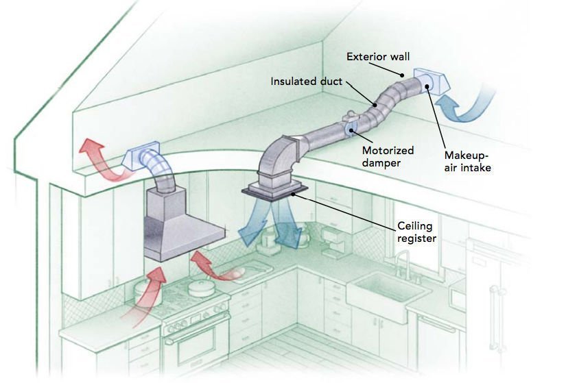 Energy efficiency includes sealing all places where air can get in, but making it hard for air to enter presents some challenges when it comes to ventilating exhaust. Air must get in to replace the air being removed, and heaters and air conditioners are not always up it. When an exhaust appliance removes air from your house, an equal volume of air must enter. In older homes, the leaks and drafts present would supply any necessary makeup air. In newer or more energy-efficient homes, there aren’t enough random air leaks around windows, doors, and mud sills to make up the exhaust air. Makeup air is then pulled through water-heater vents, clothes dryer vents, or down wood-burning chimneys, a phenomenon called backdrafting.