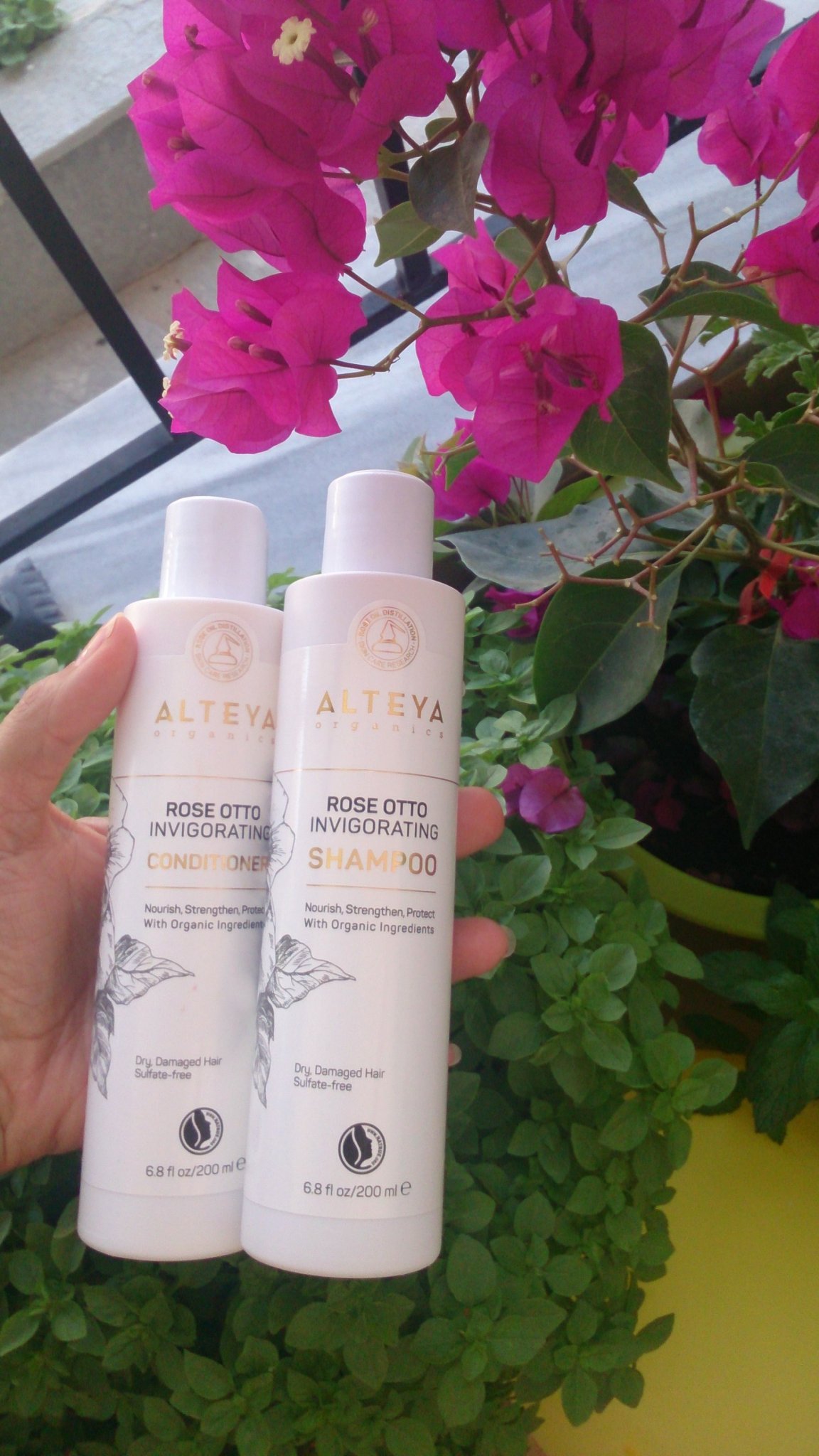 Искам да кажа две думи за едни шампоан и балсам, които не са профи, но са добри. Rose Otto на Алтея Органикс. Изключително чист и хубав състав, купих ги за малката, че с това ежедневно мокрене на косата с морска вода се налга ежедневно миене. Косата й е къдрава и с все още не достатъчно плътен косъм, защото чак сега се оформи постоянната й коса. Тя е на три и половина и първата й коса беше черна, падна напълно и се показа тъмно руса къдрава коса фин и тънък косъм, която също постепенно падна напълно и сега вече е със нова коса - също тъмно ръса и къдрава, но с по-гъста коса и нормален косъм. Вчера тя имаше имен ден и след плажа трябвашеда ходим на разходка, на игри и т.н. Аз предния ден си измих косата и не исках да я мокря, за да не се налага миене, но като влязах във водата ме намокриха цялата и косата ми също. Като се прибрахме я измих с тази серия и спонтанно реших да я пробвам и аз, за да не се бавя с дълго миене на косата.