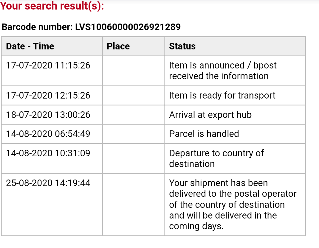 Днес получих известие, че пратката е в колетното в моя град. Пак сравнително бързо пристигнаха.