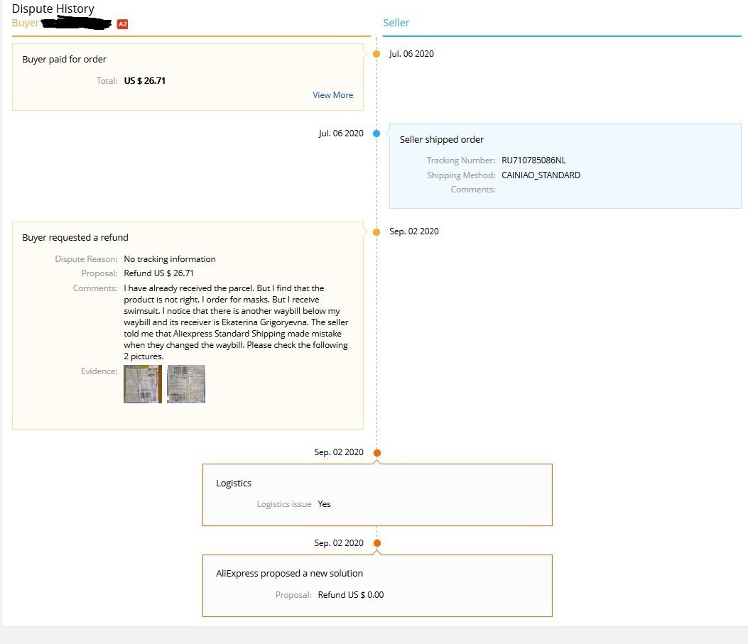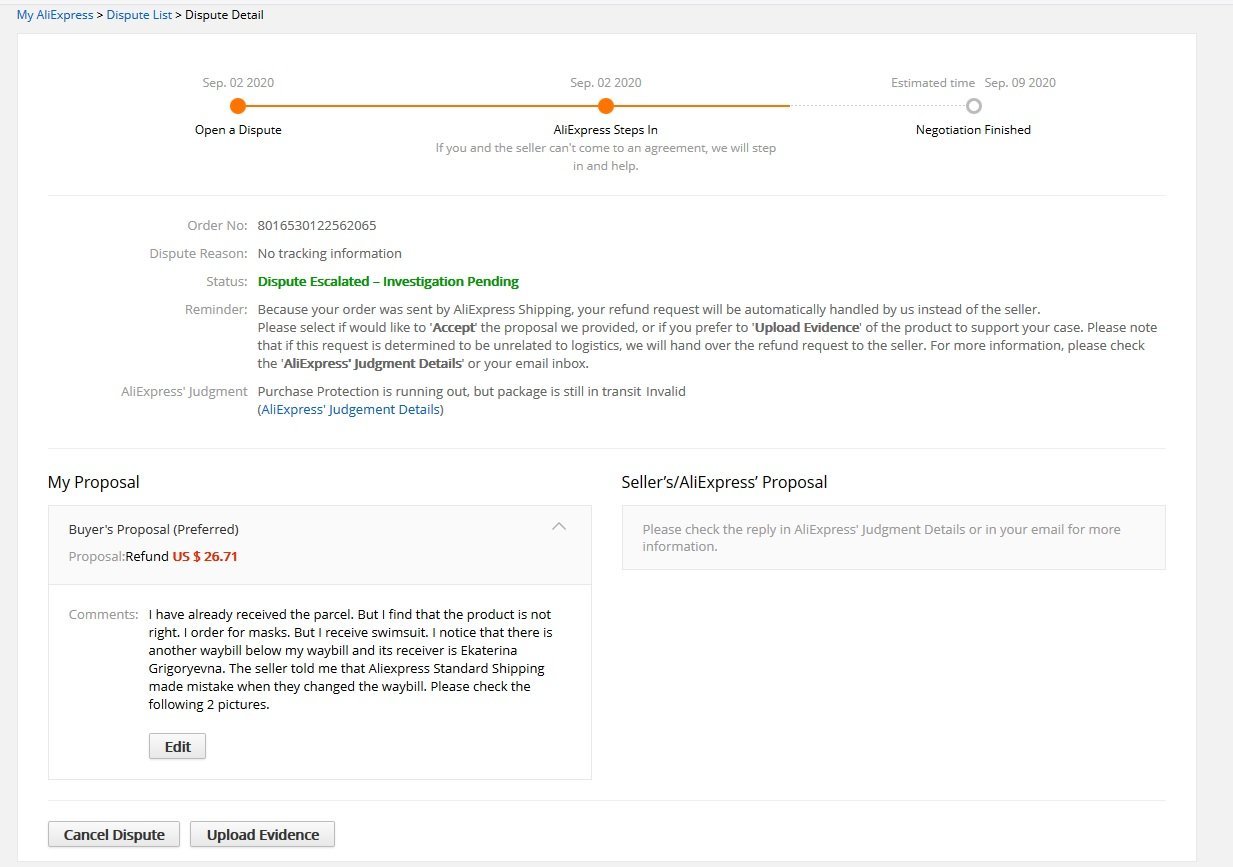 Здравейте, моля за помощ от някой запознат с пазаруването от Aliexpress. Случаят е следния - имам пратка, която при пристигането в Холандия е пренасочена не към мен и съответно аз не я получавам. Получих чужда пратка. Вижда се на пакета как върху етикета с адреса и информацията за пратката /адресът е в Беларус/ е залепен нов етикет, на който пише от Нидерландия до България и моя адрес за получаване. В следствие на това аз не получих това, за което съм платила. Писах на продавача и изпратих снимки, на които ясно се вижда грешното пренасочване на пратката. Продавачът ме посъветва да повдигна диспут и какъв текст точно да напиша. Сега видях, че състоянието на диспута е "Status: Dispute Escalated – Investigation Pending" и има срок до днес 09.09.2020г. да направя нещо, но не мога да разбера какво. Прилагам скриншот. Моля за съвет, ако някой е запознат.