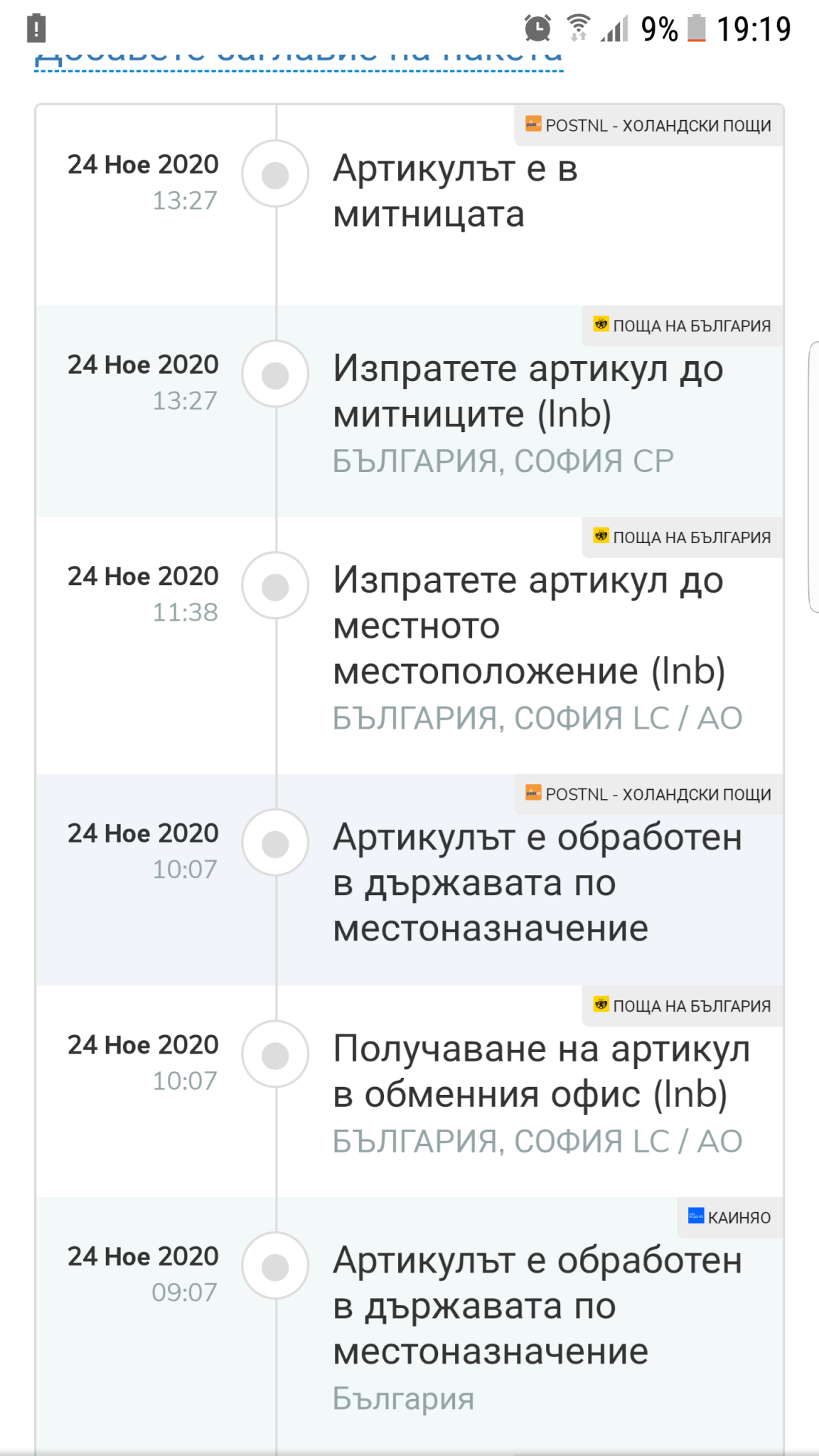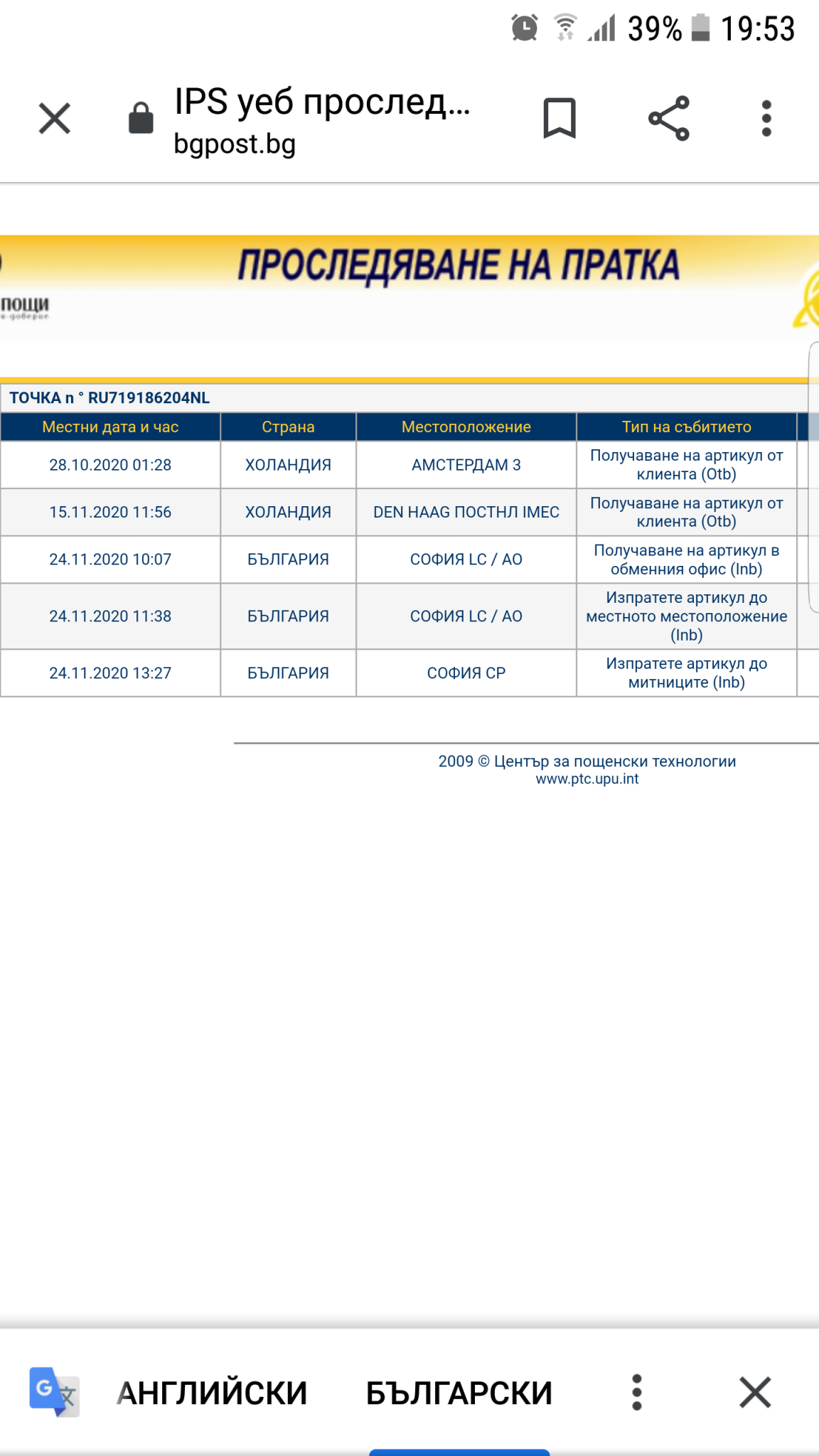Сега погледнах една пратка която пуснах до английски превозвач и ми дава следния статус: