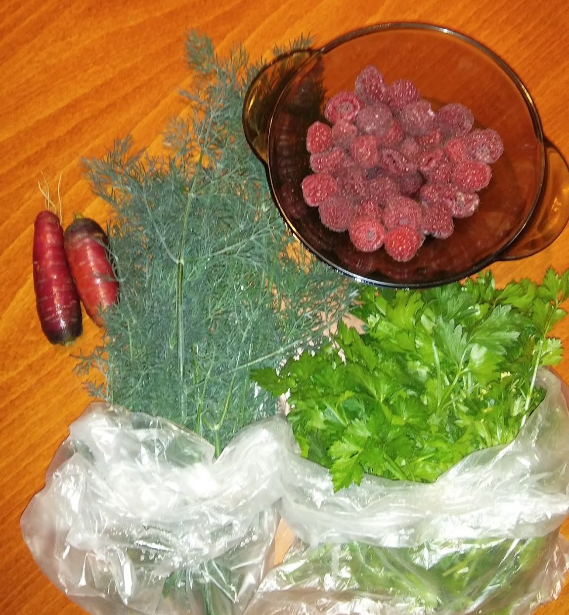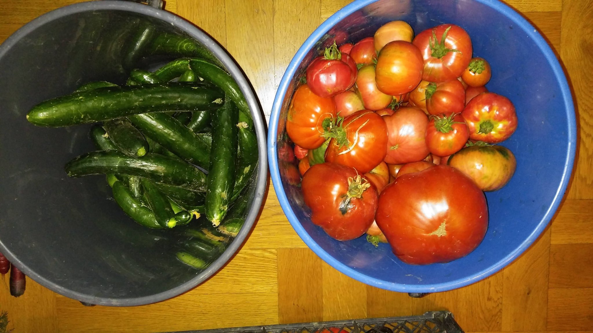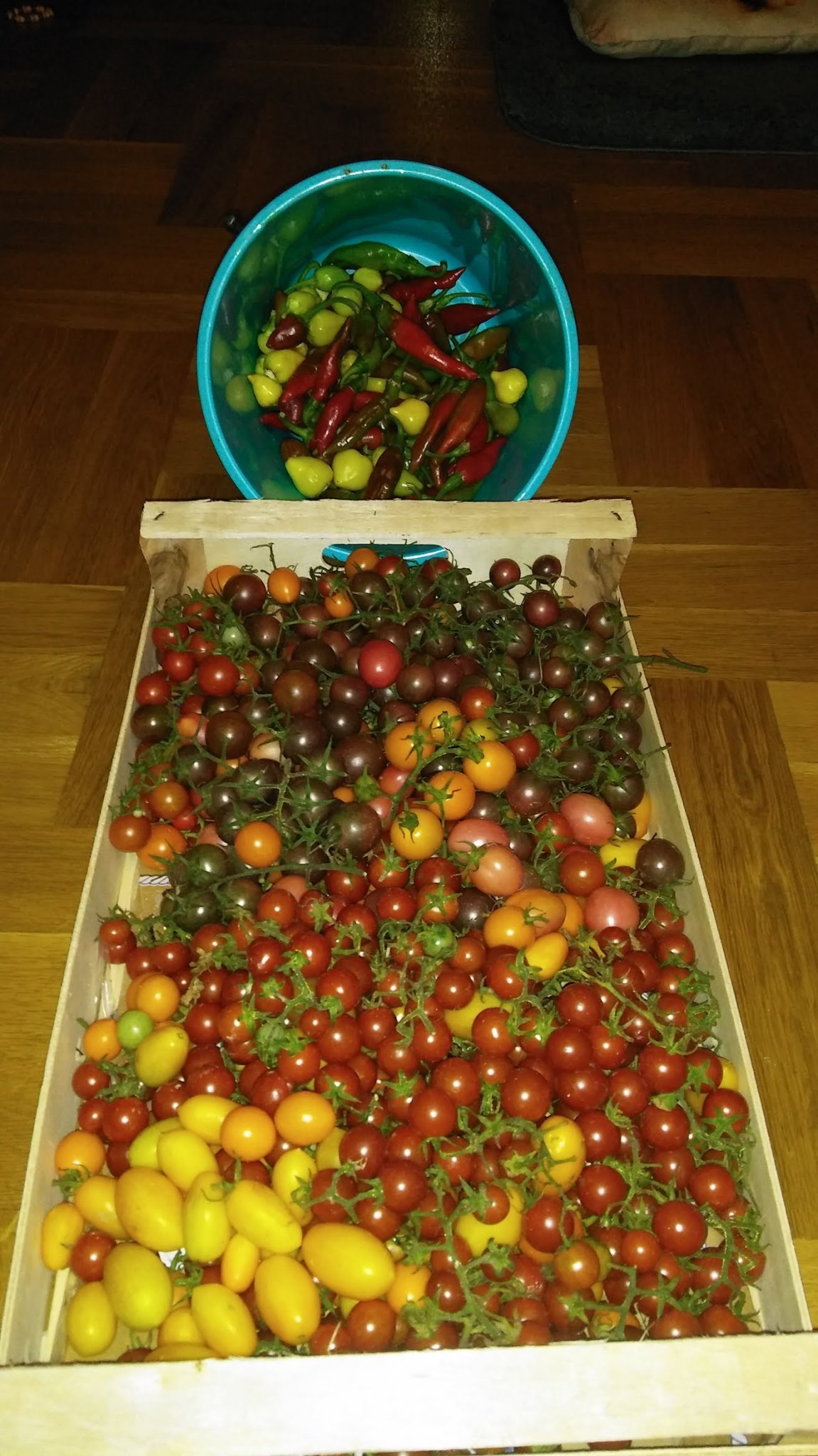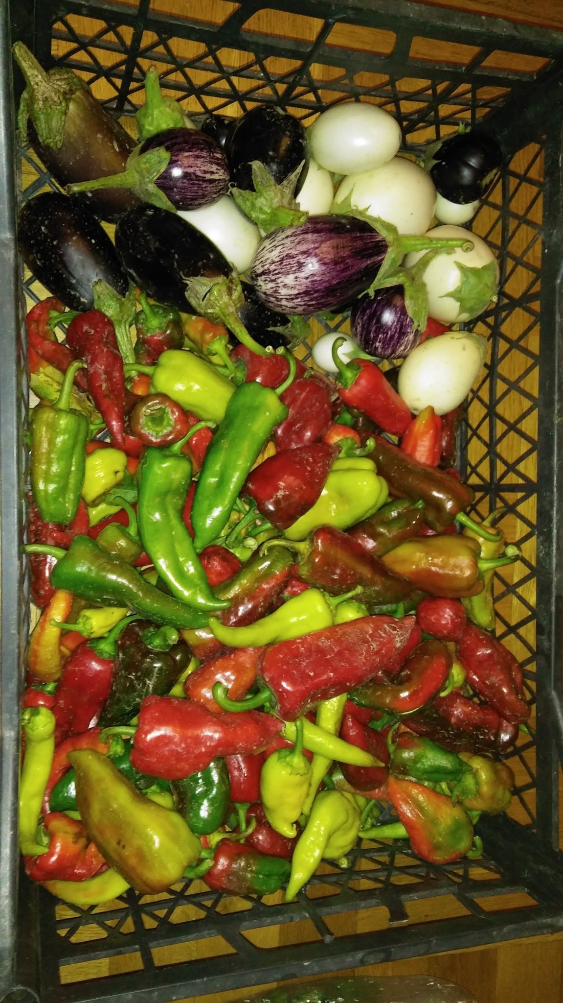 А това са нещата, които набрахме днес. Почват да попривършват доматите и останалите зеленчуци, но засега има и доста залени и не бързам да ги махам ако и тази година се задържи топло до късно. Изкарах и 4-5 корена батати, доволна съм, другата седмица мисля да орежа стъблата и след няколко дни да ги извадим.
