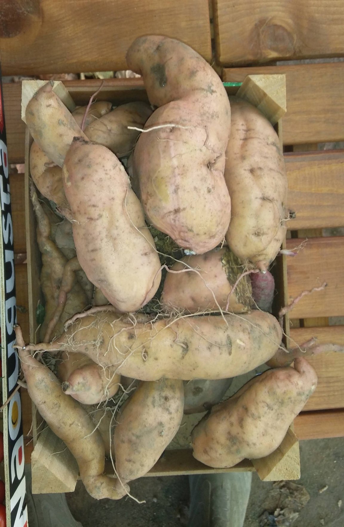 Преди малко писах на мъжът във фейсбук от страницата Батати, кога най-късно могат да се вадят. Повечето ми филизи са от мои отгледни от купени от него миналата есент батати сорт Тайнонг. Юни месец си купих от него и по десет корена от сорт Червен женшен и Бонита, но от тях още не съм вадила. Той каза, че най-късно се вадят когато паднат температурите и има слани. Общо взето октомври месец. Днес имаше един корен, който имаше много малки батати, тоест дълги, но тънки, но май е от тези, които съм пресаждала и затова е такъв. Според мъжът от фейсбук Батати, им трябват около 110-120 дни от насаждането и топло.