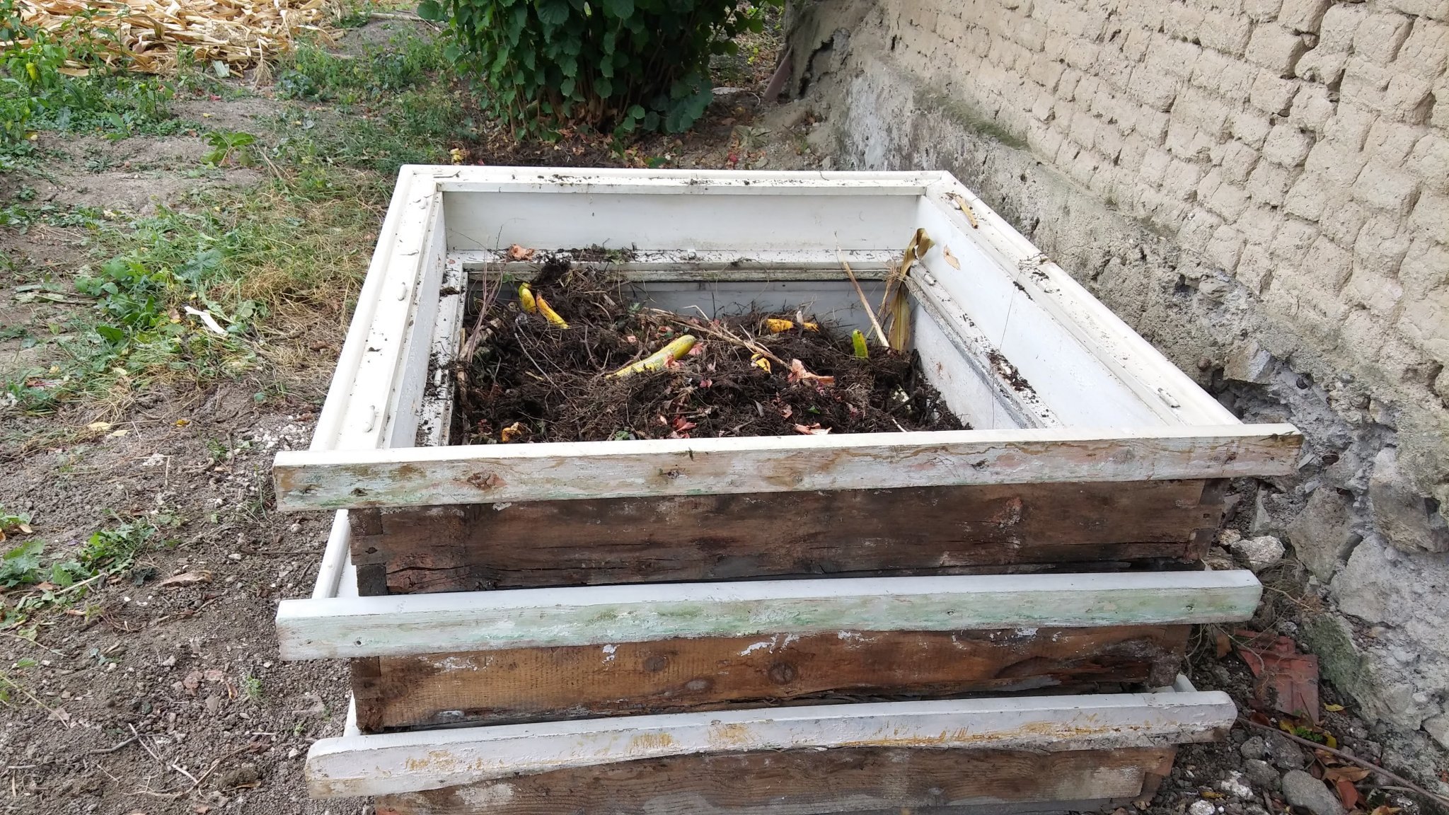 От години компостирам просто на една купчина, но сме на края на селото и място бол. Първо бяхме нагласили рамка, сега и без нея карам. Става чудесна пръст за разсадите след като се пресее.