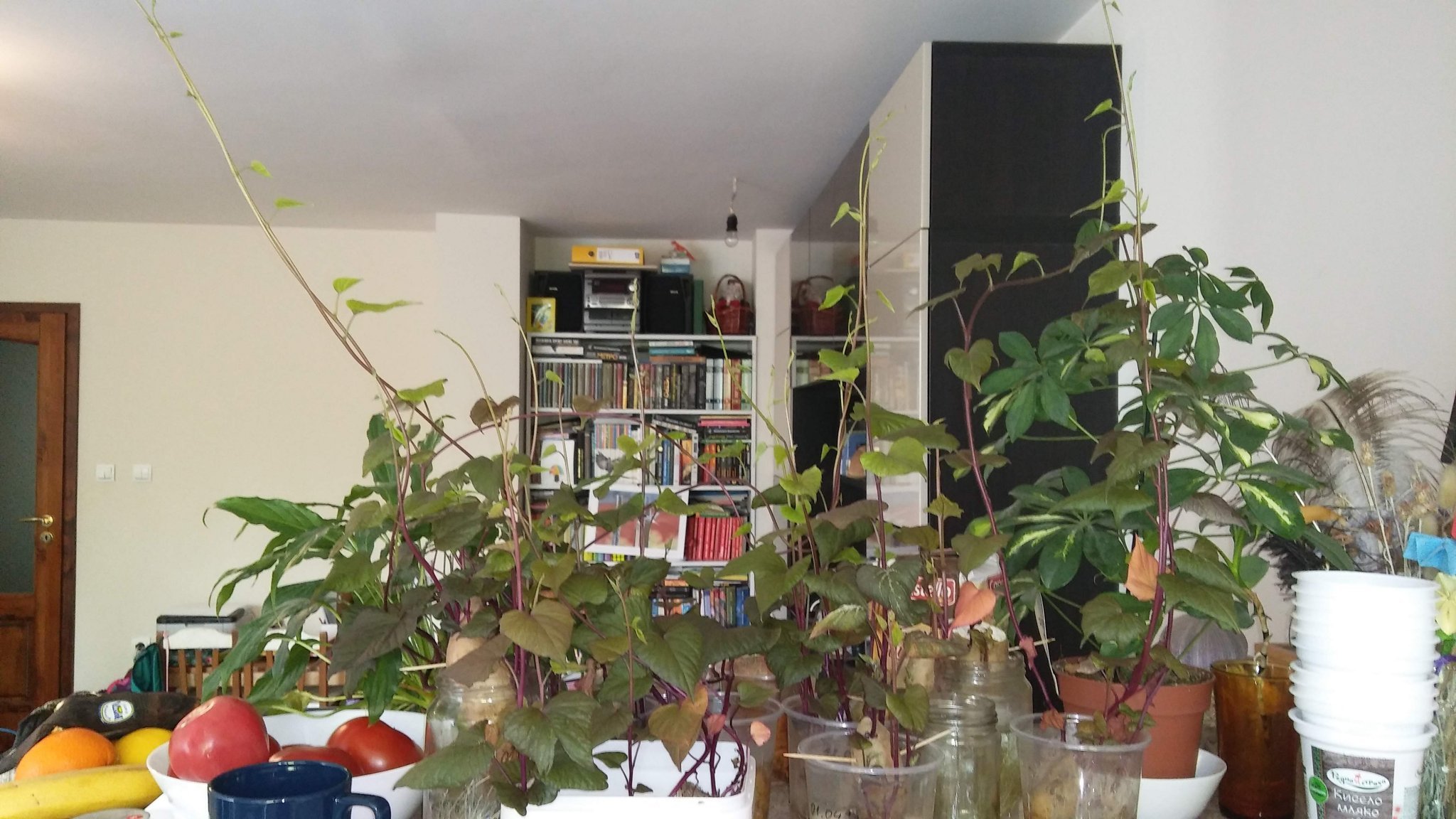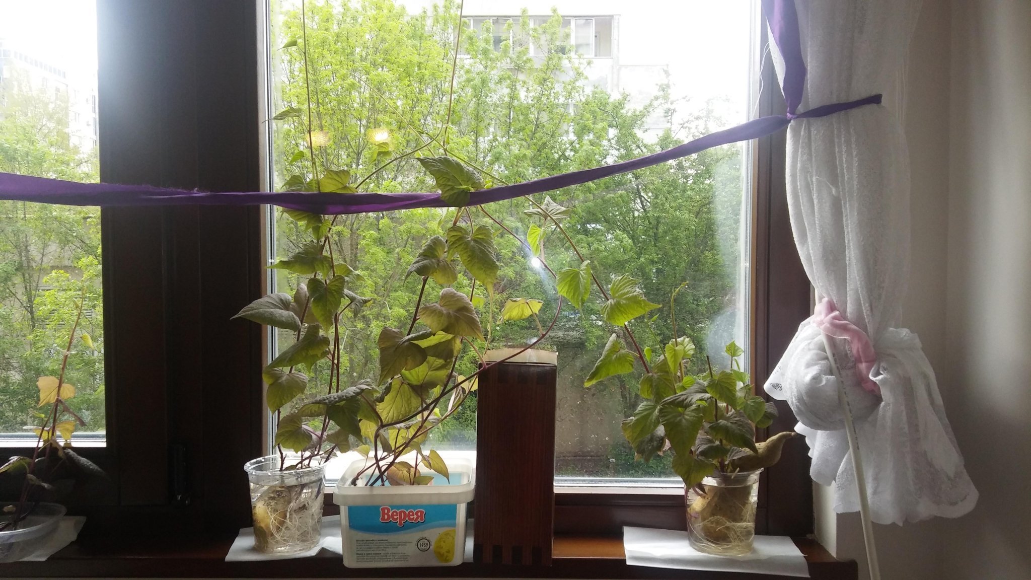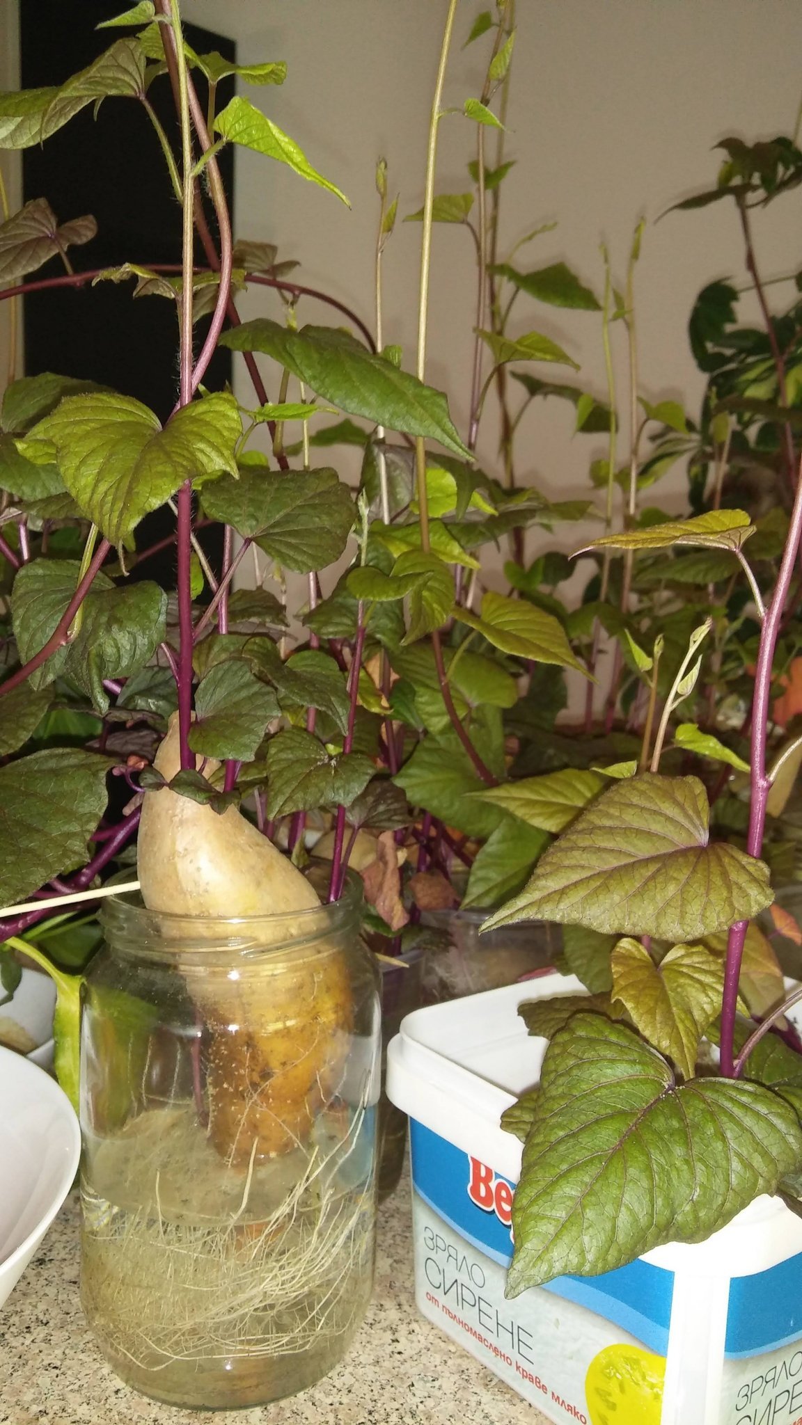 Моите батати зеленеят, но едва ли ще имаме сладки картофи. Твърде късно направихме разсад и то от чисто любопитство. Не мога да не спомена, че в една от веригите продаваха коренчетата по 7 лв. (от Холандия) много след всякакви разумни срокове за засаждане Sad.