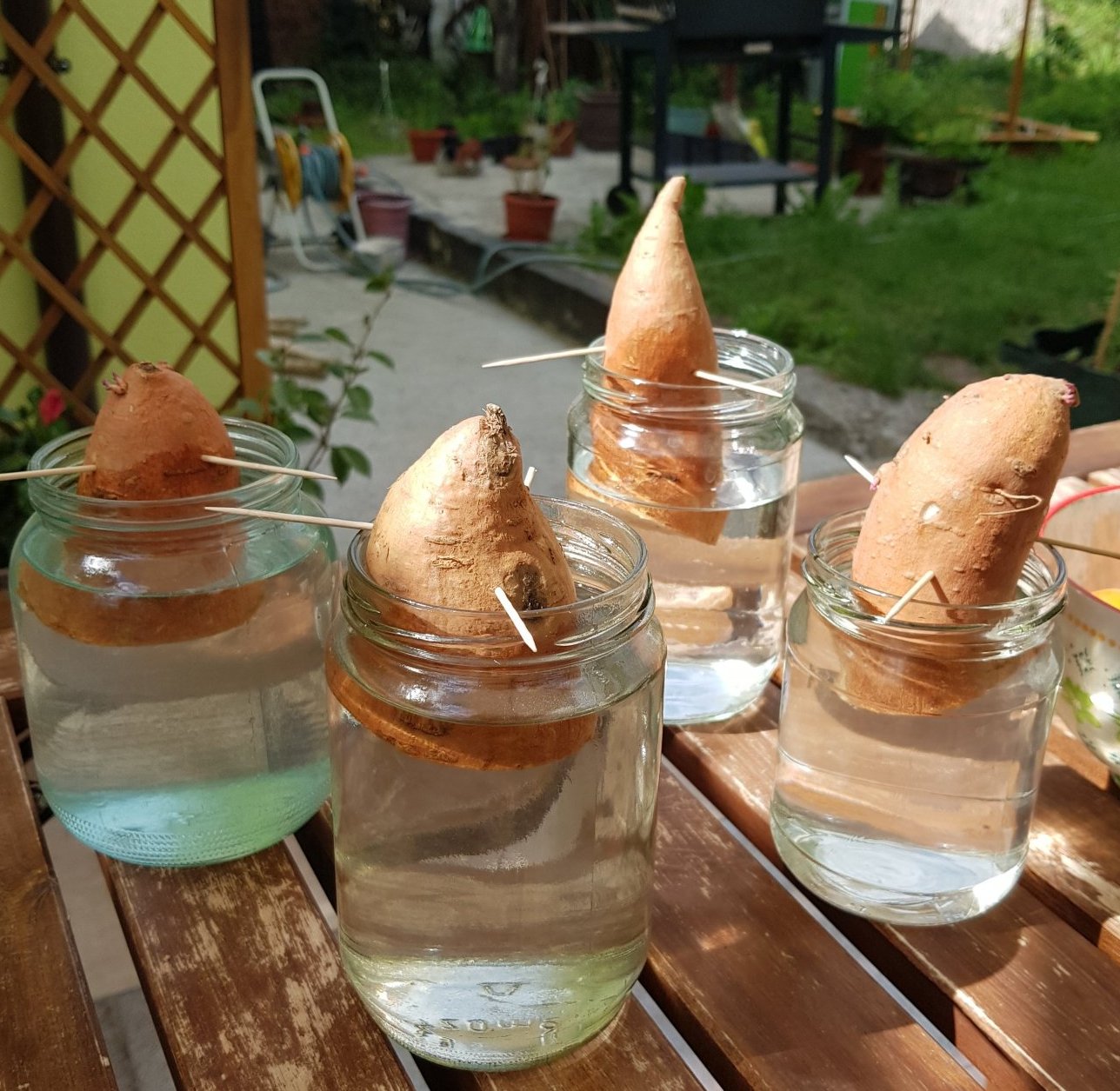 Много бързо прорастват. Махаш ги от батата смело, за още една седмица във вода пускат коренчета и са готови за садене. Последните ги засадих направо с бататите, защото вече нямах място. Както казах не очаквам да хапваме сладки картофи. Просто всеки път ме изумява и радва, колко енергия и живот имат подобни растения. Успех!