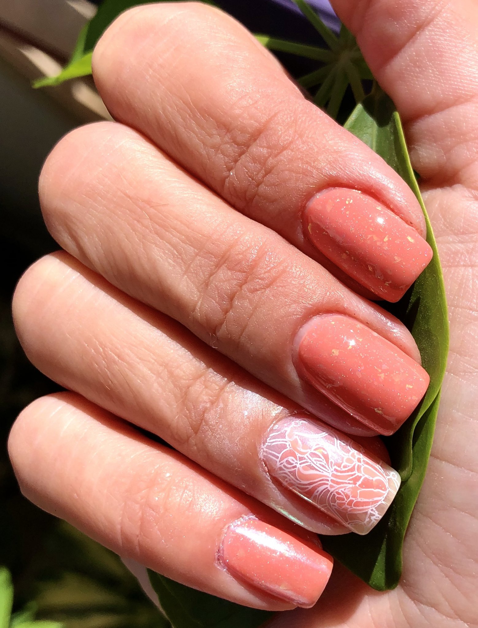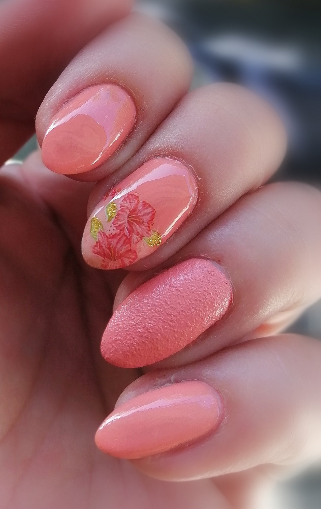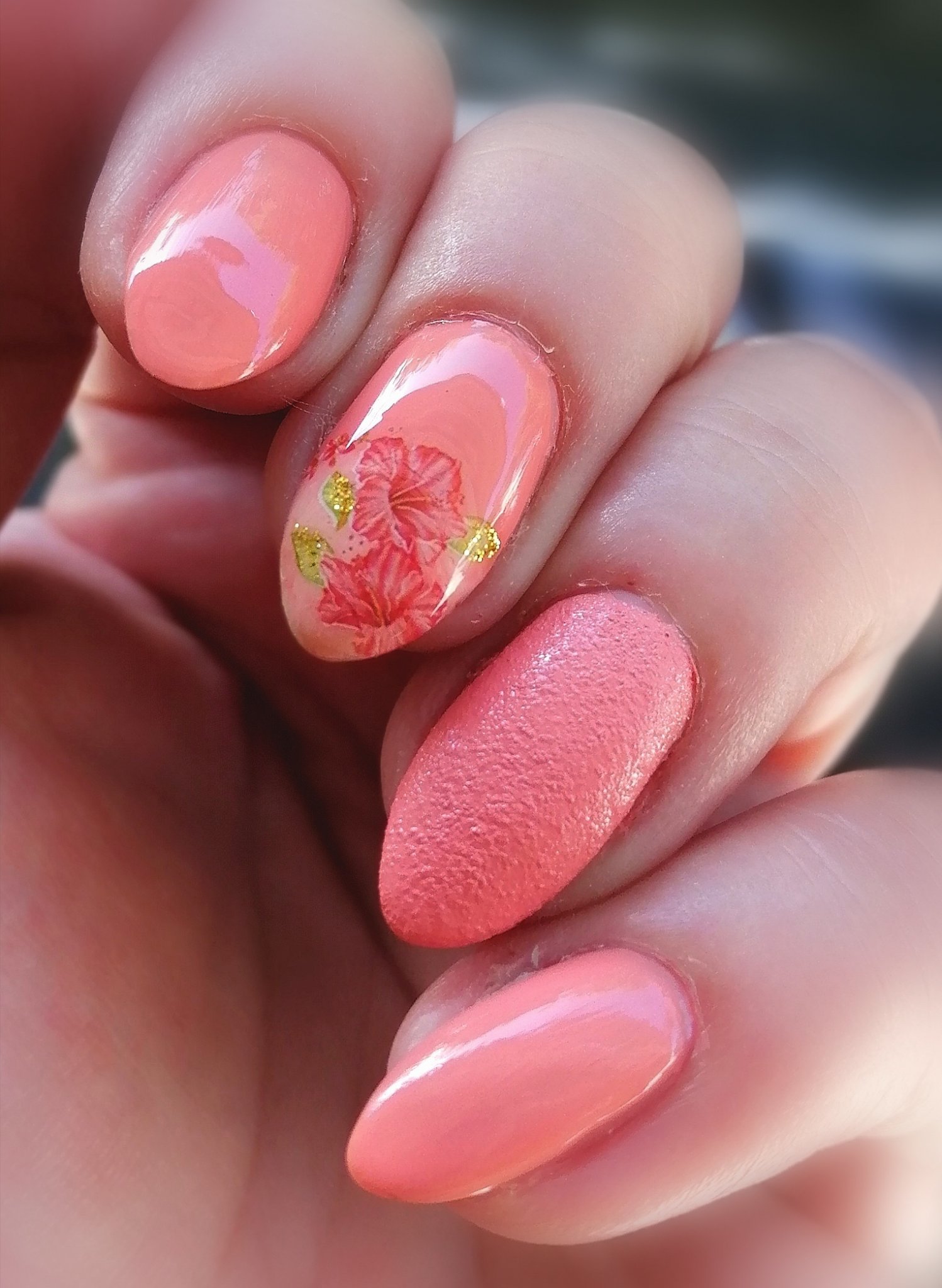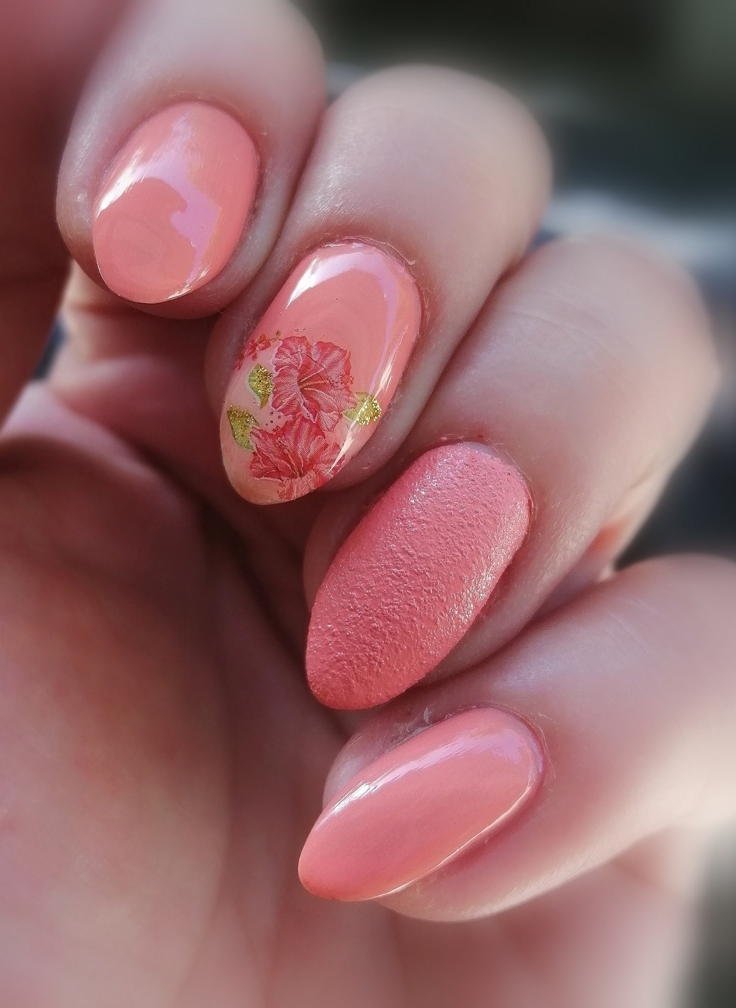 Долче, да, на безименния е пясък на Пърфект, номера се е изтрил. Идеята е за маникюр с различни текстури, на палците и безименните е пясък, на другите пръсти гланциран крем. Той е на ГР от серията Paris, номер 242. Идеята беше за нежна преливка на средния пръст на който декорацията от ваденки да се откроява повече, но поради бързината стана както дойде. Grinning