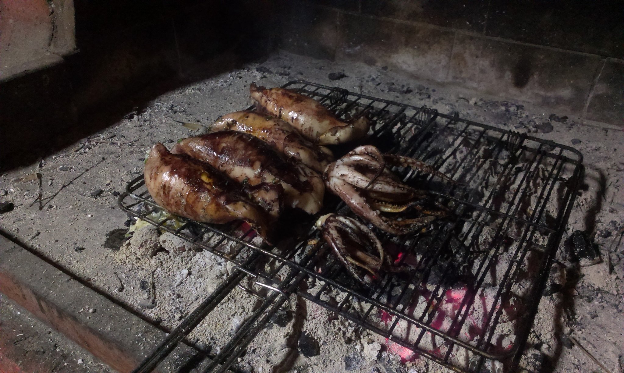 За пълнени калмари на скара според мен е по-подходящо да се ползват така наречените фрапсала, изглеждат като калмарите, но са с някаква разлика в пипалата. И цената им е по - ниска. Аз ги правя като смесвам няколко вида гръцки сирена - кефалотири, гравиера, касери, мецовоне и фета, плюс магданоз. Пълня, защипвам с клечки и оставям поне за час да се мариноват в зехтин и чесън, като обръщам от време на време. Пека на скара около 6 - 7 минути от всяка страна. Ето нагледно резултата, макар снимките да не са много качествени Simple Smile