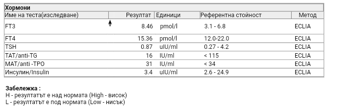 Да, храня се ВМ-НВД, тъй като преди около 5/6 години бях с инсулин на гладно 10 и правех много често хипогликемии. И с този начин на хранене намалих стойността му и вече нямам хипогликемии. По- интересно е, че си открих по-стари изследвания/01.2019/ Т3 под норма, една година по-късно е над нормата, а след още 4 месеца - отново е надолу. Не пия нищо освен противозачатъчни заради кисти, и съм на кортикостероиди за астма. Не знам дали имат връзка с резултатите.