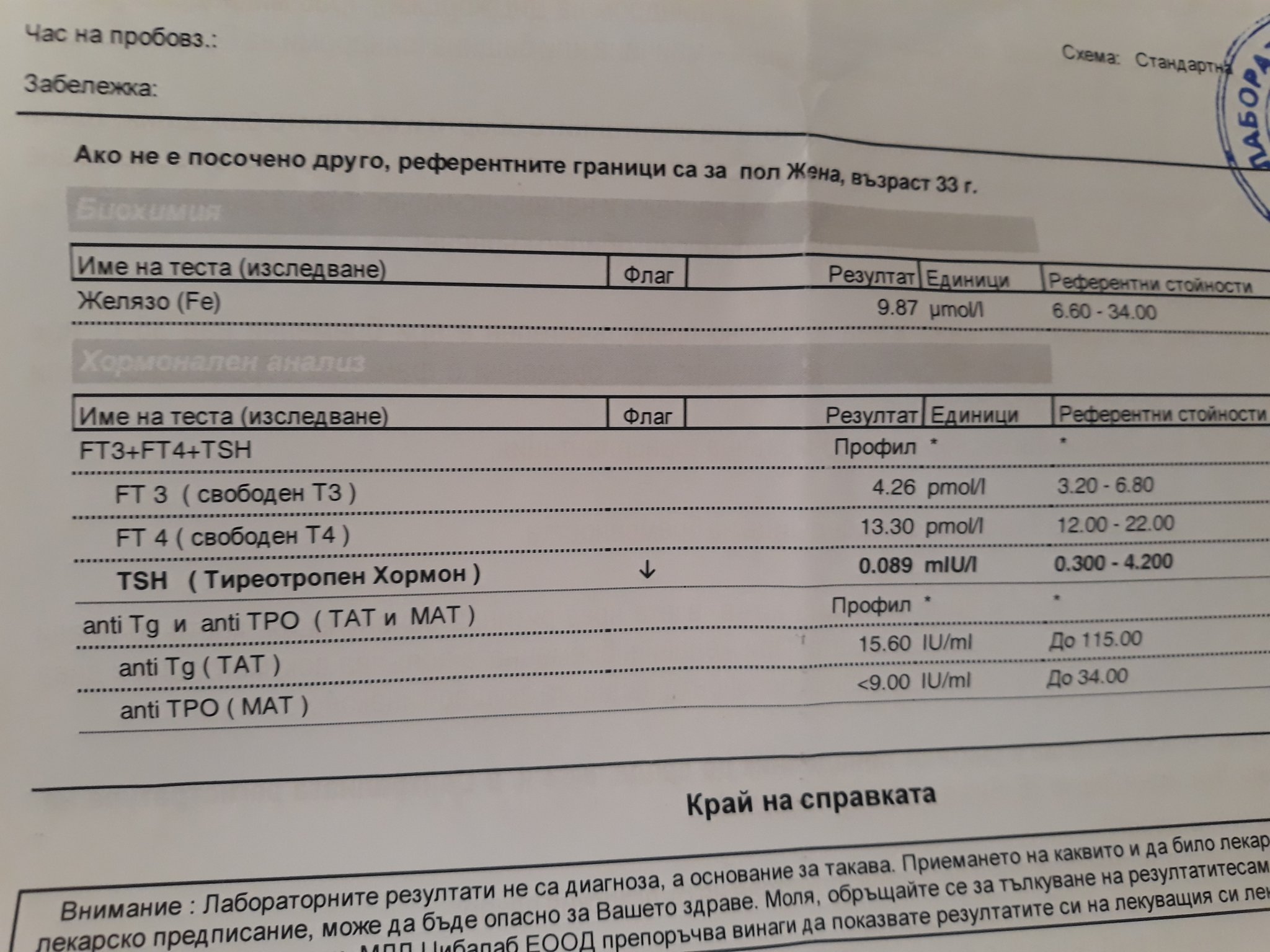 Това ми е второ тсх, в рамките на месец. Първото беше още по зле-0.00нещо си. Следващата седмица се надявам, че ще успея да стигна до ендото с нови изследвания, защото сега ми предстои  планова интервенция от нефрологичен характер. След раждането, имам чувството, че почнах да се разпадам. Никога преди това не съм имала каквито и да е оплаквания.