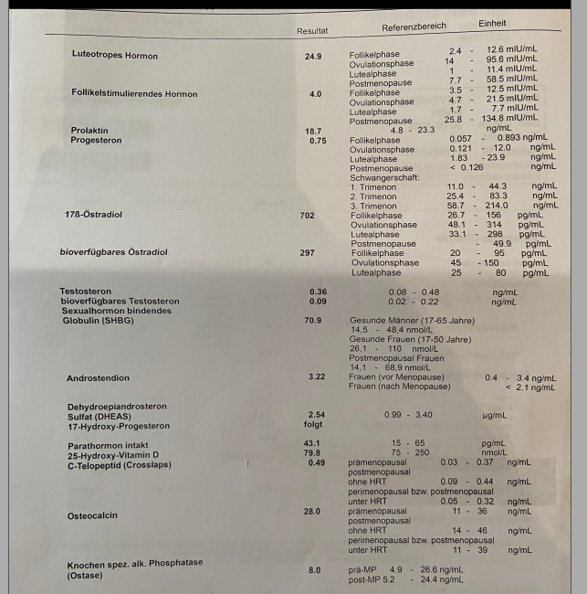 на 34 г. съм и опитвам да забременея - имам вече 3 Abortus Habitualis (последния на 2ри септември 2020). В момента търся причините за това. Миналата седмица си направих хормонален тест на 22рия ден от цикъла и се оказа, че съм била точно преди оволация и днес си пуснах изследвания за прогестерон, а пък на 3 ден от МЦ ще си пусна изследвания за Е2, ФСХ, ЛХ и 17-ОН-Прогестерон.