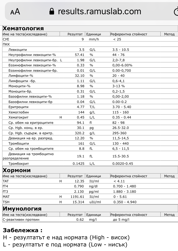 Резултатите показват, че TSH е в нормални граници, но за да се увеличи шансът за бременност, е препоръчително да бъде около 1.0. По време на бременност високият TSH може да представлява риск. Необходимо е наблюдение и предприемане на превантивни мерки. Препоръчително е да се консултирате със специалист, тъй като високият TSH може да показва начална хипофункция на щитовидната жлеза, което е важно за нормалното развитие на плода.