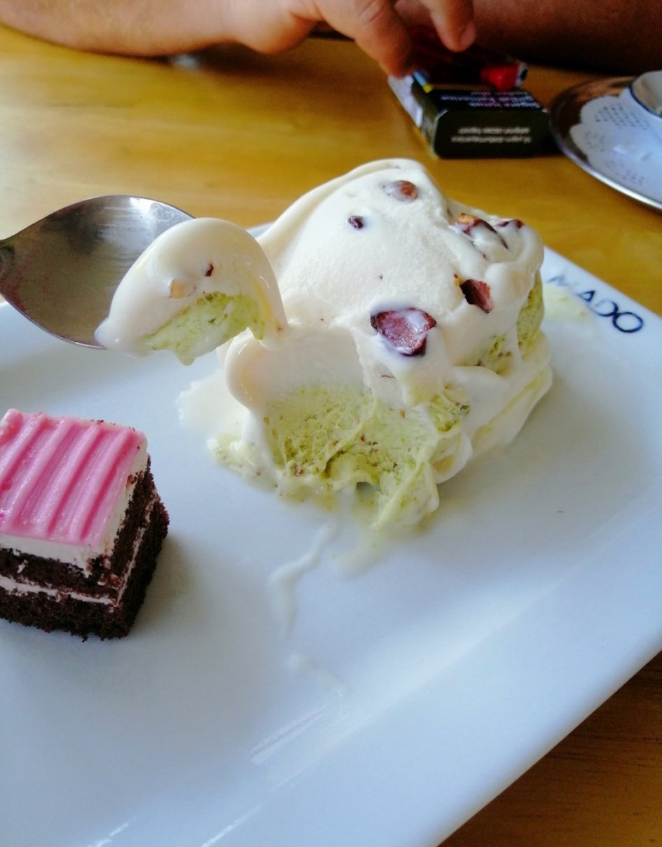 Този път бяха напудрили яко тирамисуто в Мадо, давиш се от какао... Пиша им минус. Сладоледа компенсира. Баклавата им беше сладка и сиропирана. За трети път ям и не. Не е моята.