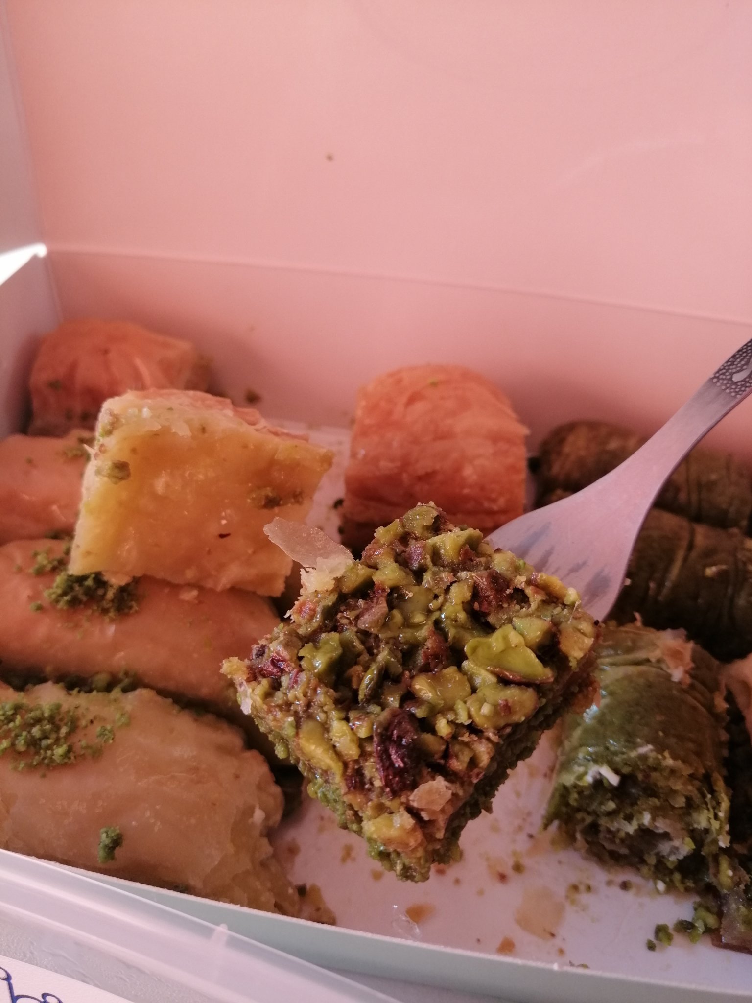 Не искам да те дразня, но все пак да кажа - има кори - слой шам фъстък - слой меко сирене - шам фъстък - слой кори. Според вкуса на ММ е по-добро от кюнефето. Аз съмот Пловдив. Тук има един магазин в Халите, в който го продават /купувала съм преди ковид-а/, но беше по-сухо, защото вероятно е постояло. Естествено цената няма нищо общо с одринската, Май беше около 50 лв. за  килограм.