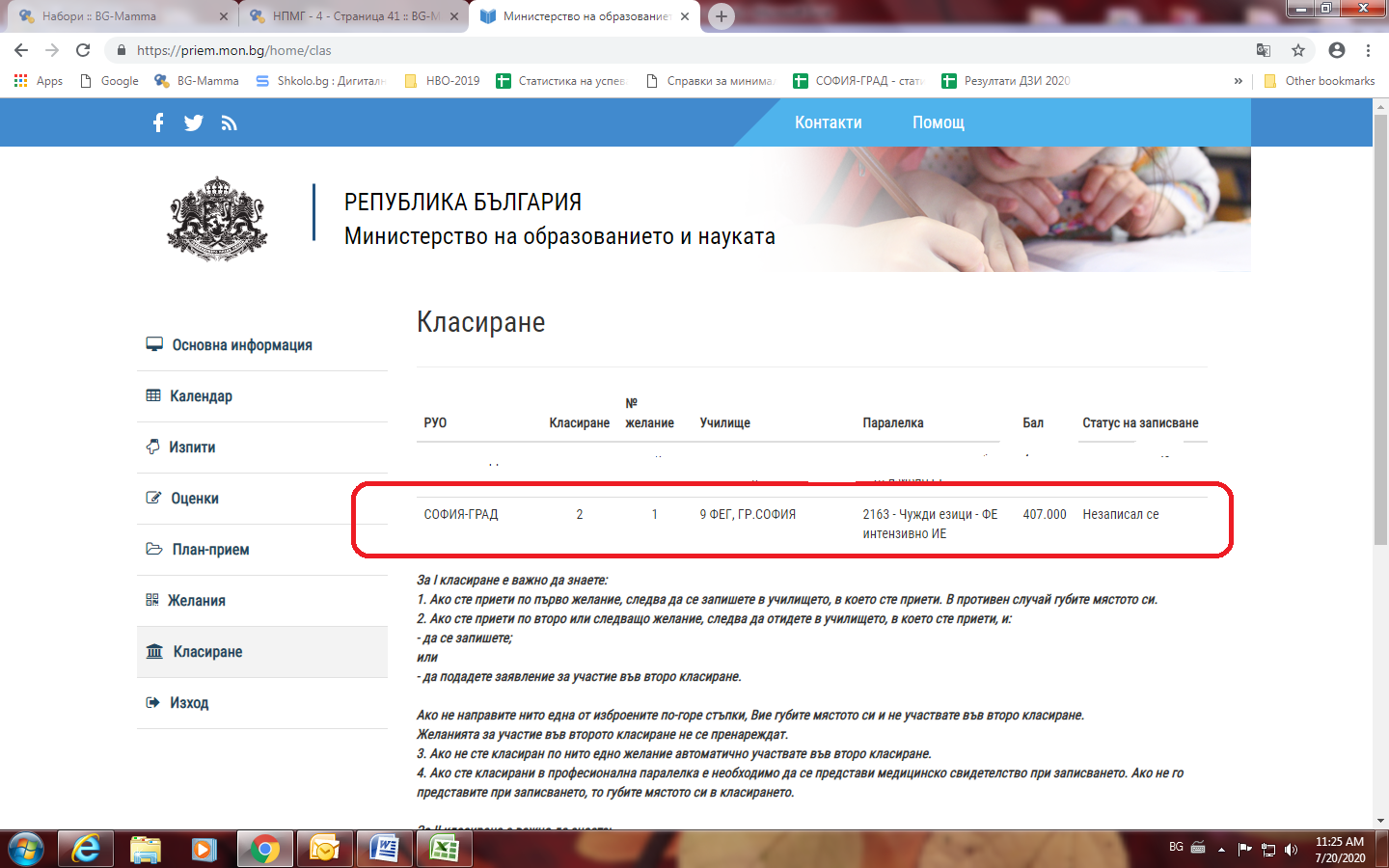 СЕДМИ клас 2019/2020 - Второ класиране - (20.07. - 26.07)