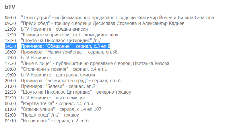 Eто линк към програмата: https://www.btv.bg/programata/?day=2021-04-05