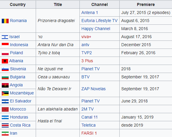 Global Agency обяви пускането на сериала  на следните канали "Планета ТВ" (Slovveniya), "Маркиз" (Словакия), Teletika (Коста Рика), ТВ Пинк (Сърбия, Черна гора, Босна и Херцеговина), Ариана телевизия (Афганистан), ZapTV ( Ангола и Мозамбик) бТВ (България), Антена TV (Румъния), Trunk телевизия (Албания), TVR2 (Полша), Rustavi 2 (Грузия), ANTV (Индонезия), Dori Media (Израел), Kurdmaks (Ирак), 2MTV ( Мароко) и Канал 5 (Македония) - 19 държави и това е огромна аудитория