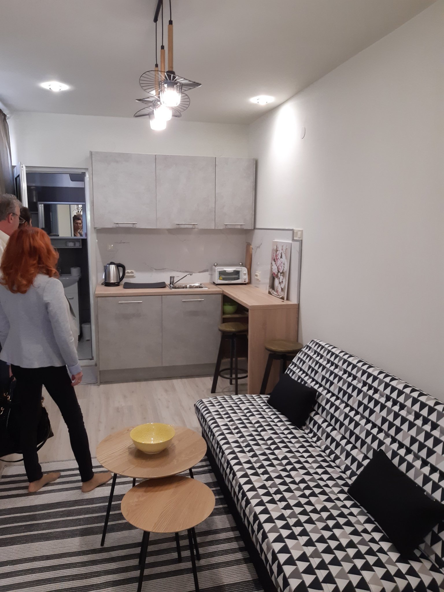 Ще стигне и за маса и холна масичка,защото дивана няма да е много голям.Кухнята е сложена, в бяло и тъмно сиво  е.Ламината също е сив,а стените са бели.Стаята е почти кадратна.