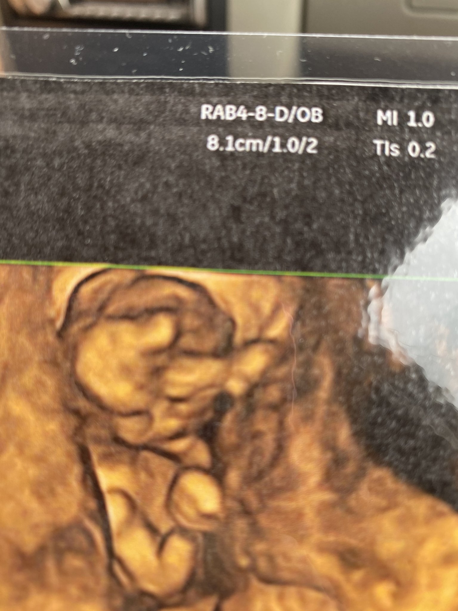 Здравейте, ето я моята първа 4д снимка, вижда са малка част от личицето, заради седловидната ми матка на този етап това е най-сполучливата снимка. Бебчето се развива добре, има си всичко което трябва да има към този момент. Чакам резултата от papp-a теста.  Вече се знае, че раждането трябва да е секцио, заради раничка на маточната шийка, която видяхме днес. Искаше ми се да е естествено раждане, но приемам нещата такива каквито са, щом това в най-добрия вариант за бебчето.