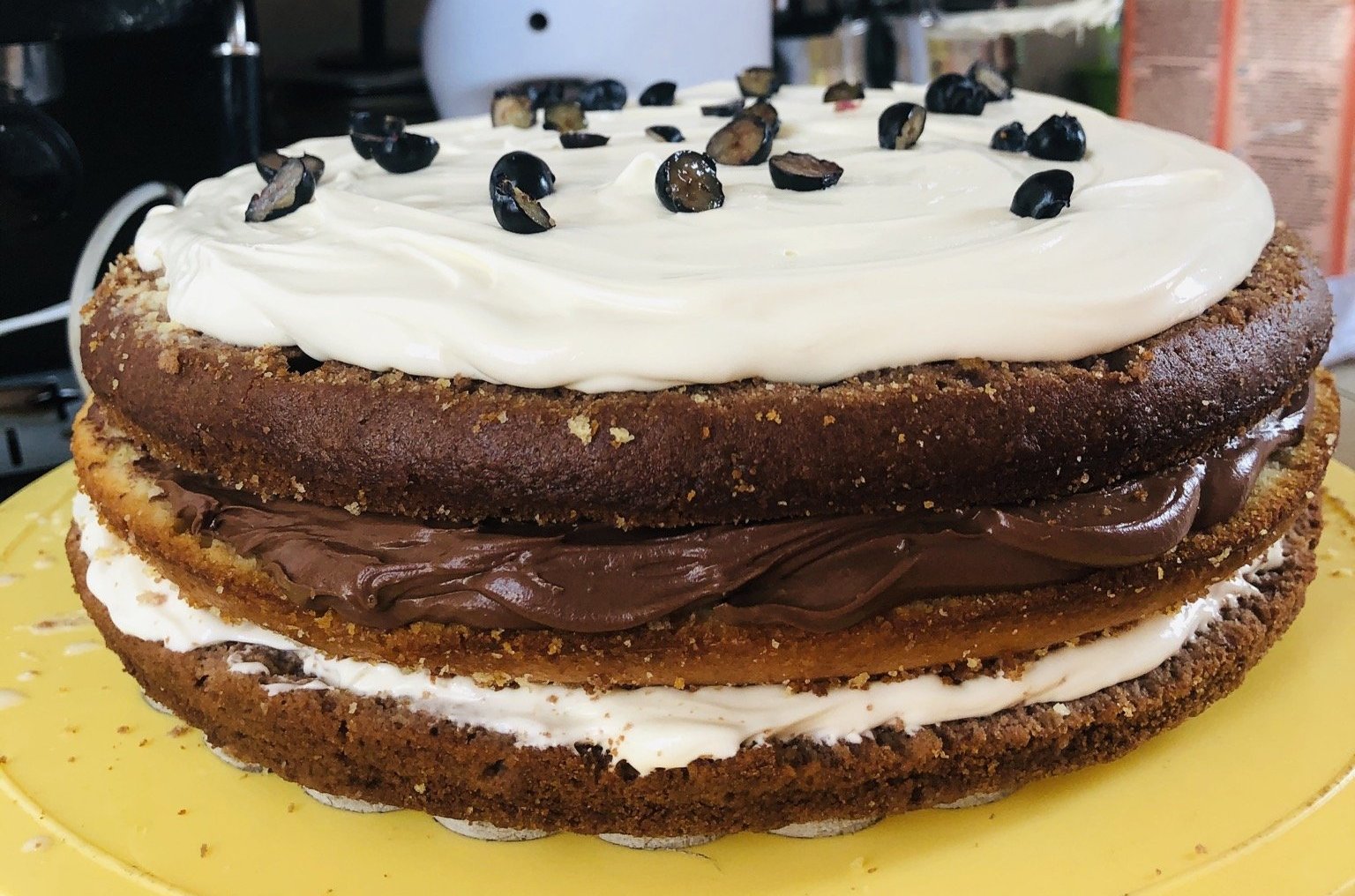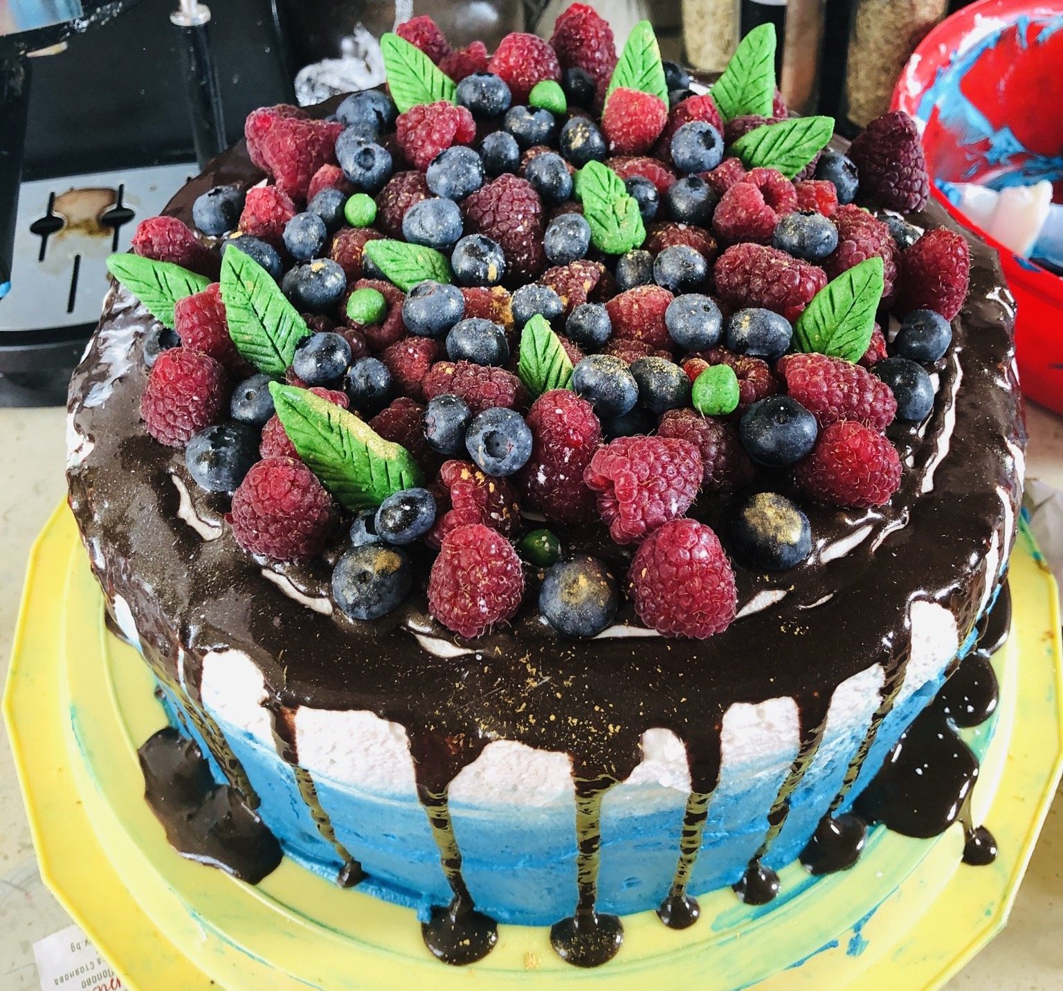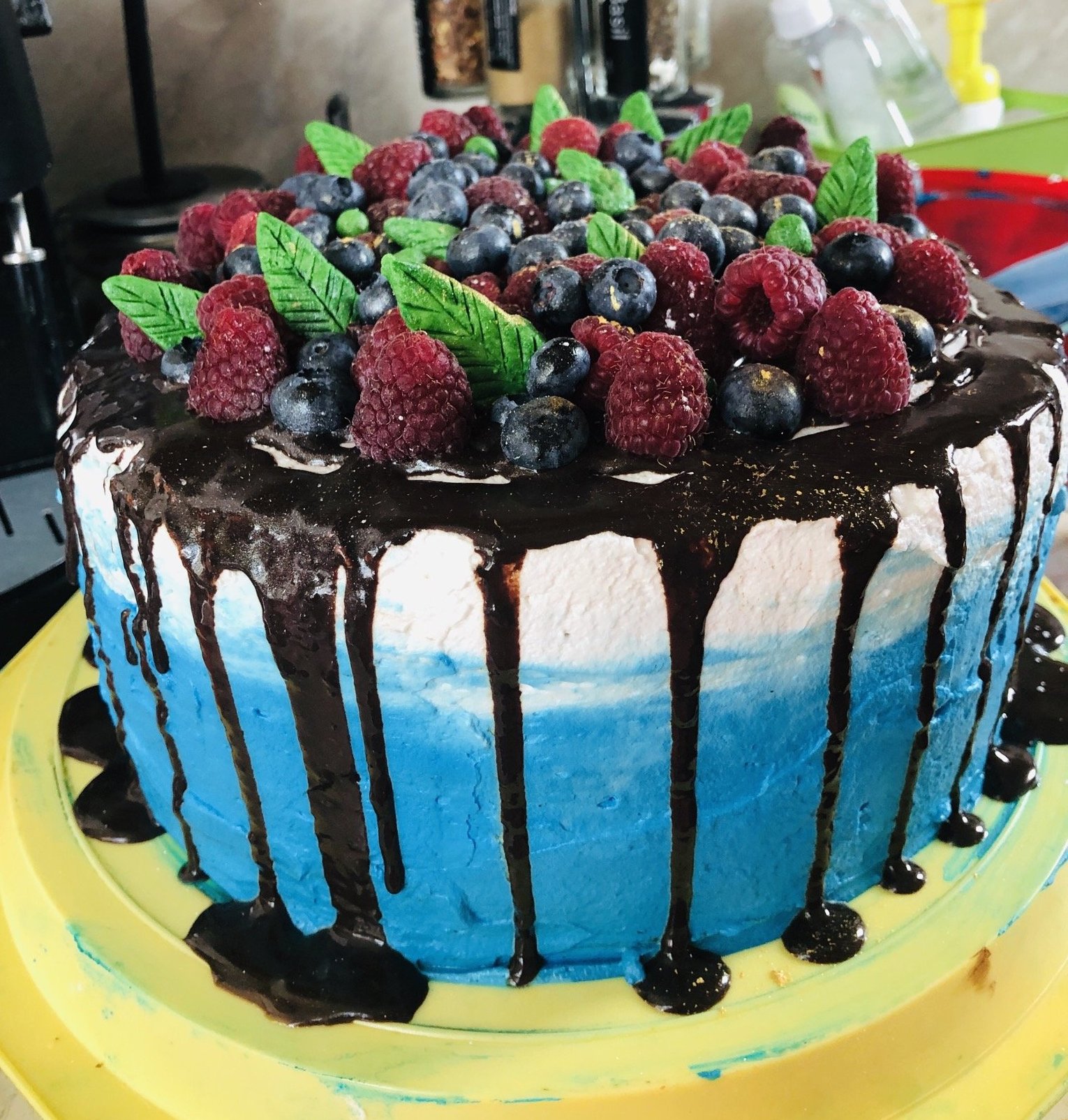 от мен една торта с два вида блат ванилов и шоколадов и два вида крем шоколадов ганаш и боровинки с бял мус