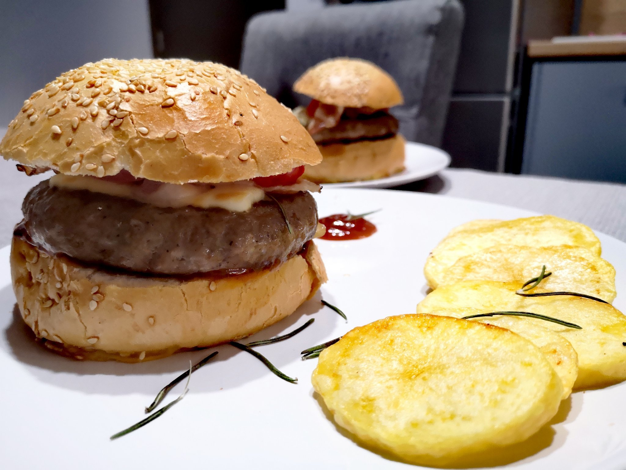 Ние днес бяхме на домашни бургери с блек ангъс, моцарела, домати, барбекю сос, лук, запържен със захар и винегрет и бекон: