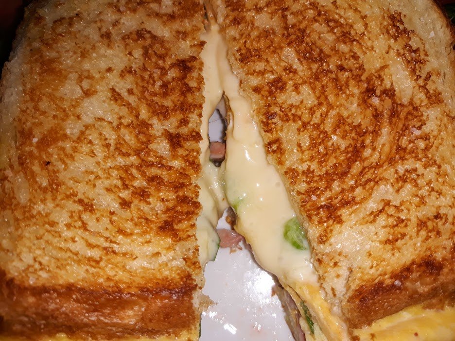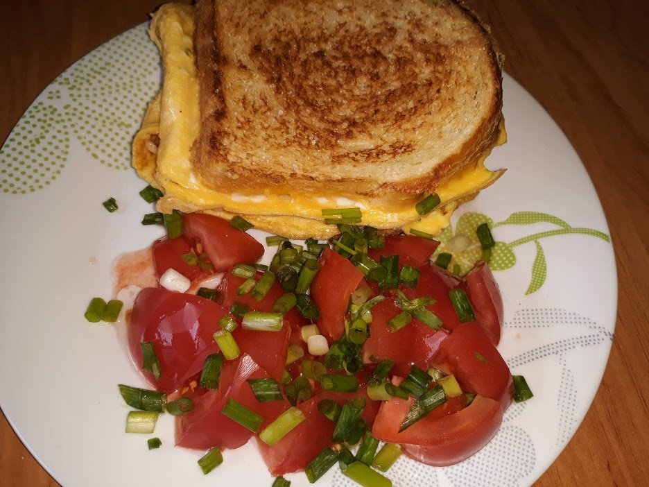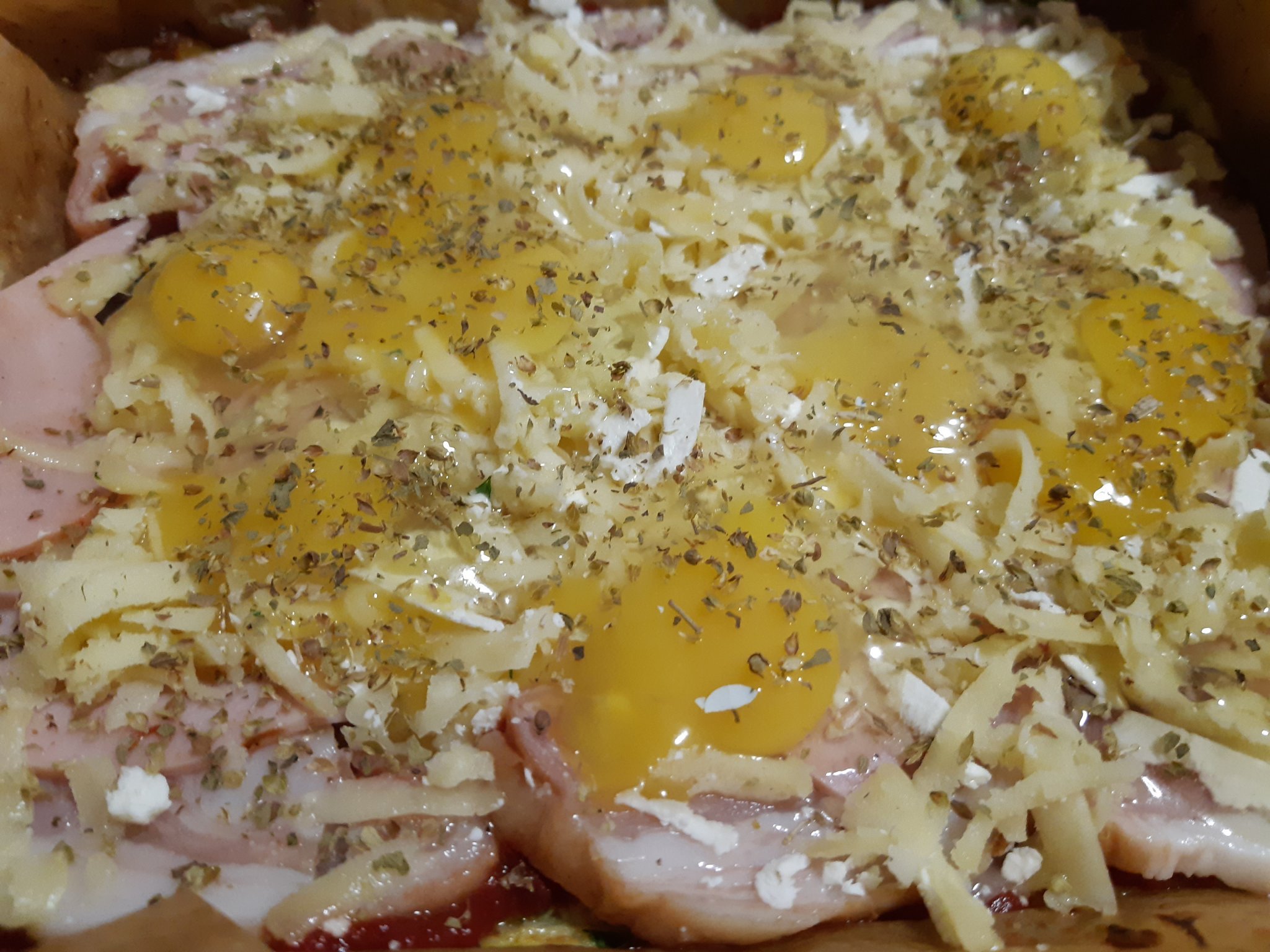 Запеканка с яйца, чушки, маслини, свинско филе, сирене, зелен лук, копър и малко препечени кори, останали от предишната запеканка.