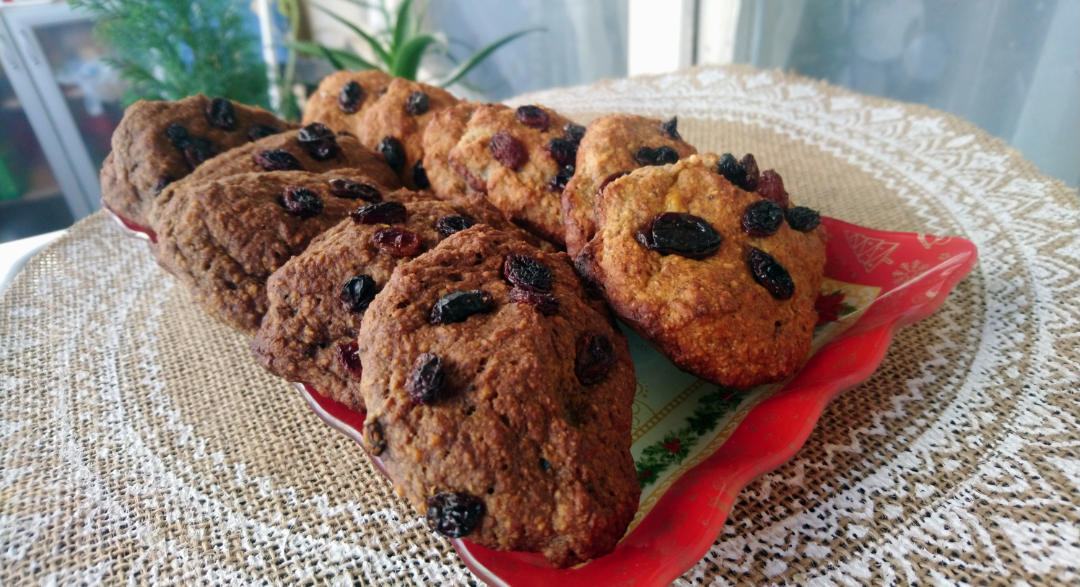 Безглутенови бисквити с белтъци, банани, лешници, бадеми и стафиди (половината с брашно от рожков)