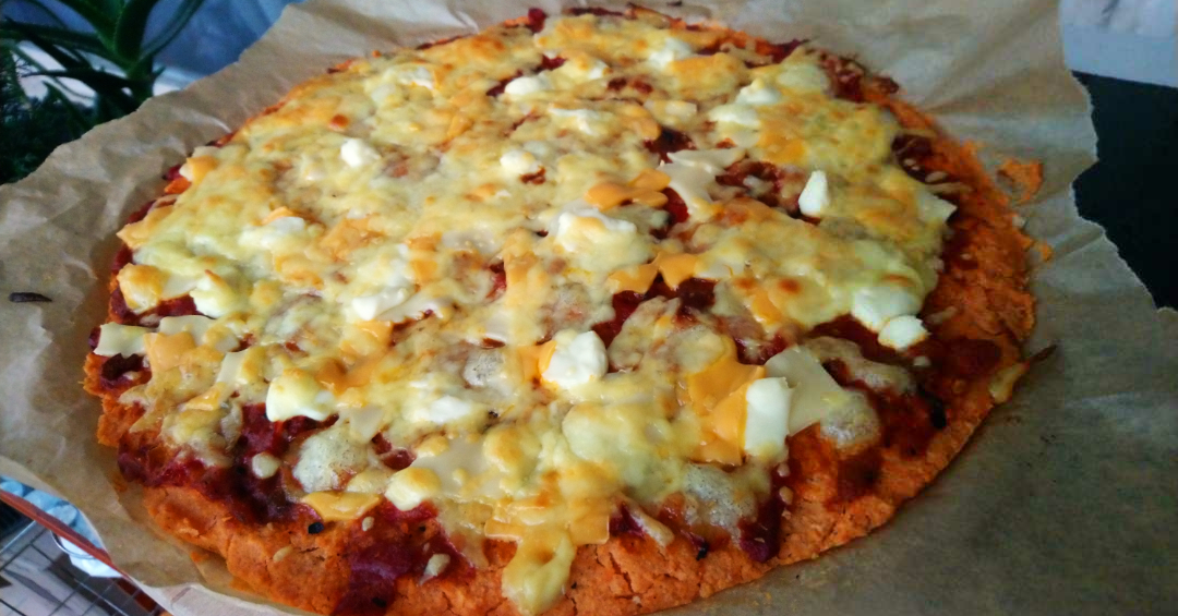 Безглутенова пица с блат от червена леща, лютеница, моцарела, топено сирене, кашкавал, чедър и ементал